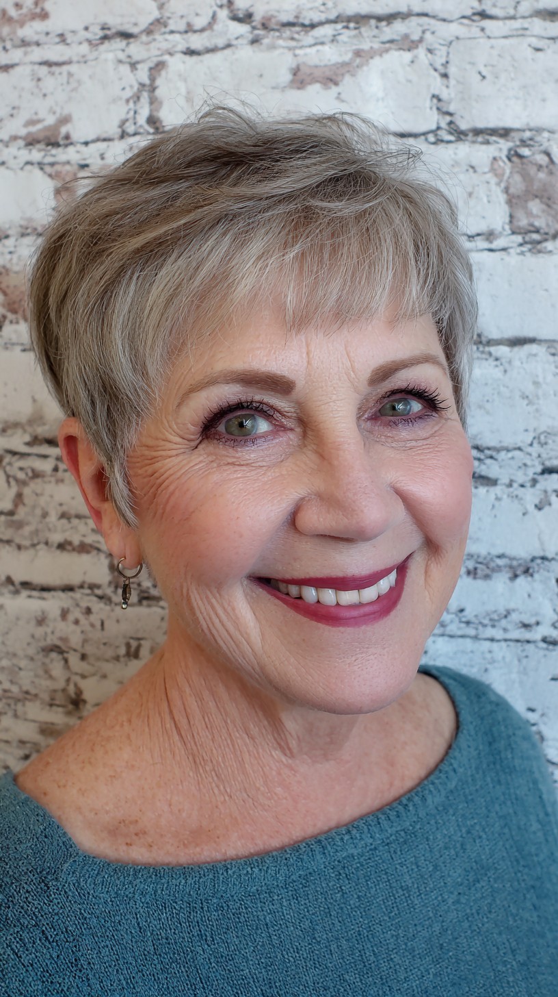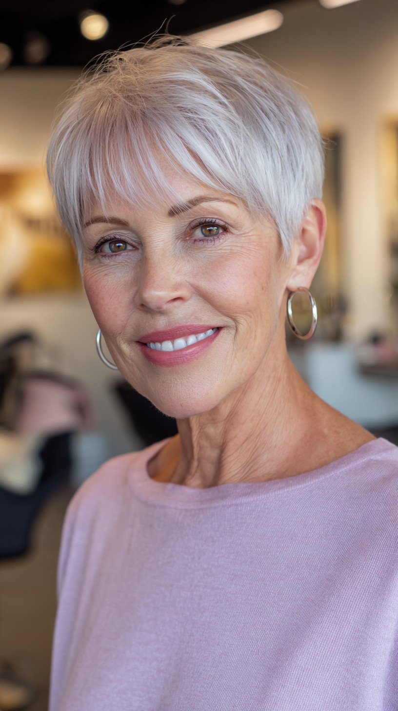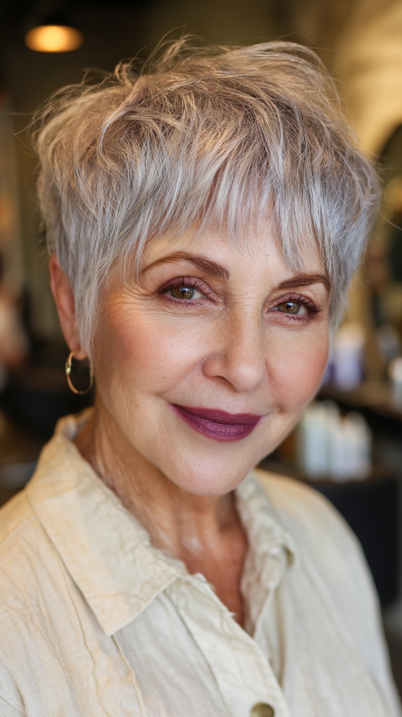 This textured silver pixie cut is perfect for mature women looking to refresh their style. The hair is cut to a short length, with soft bangs that beautifully frame the face, making it ideal for oval or heart-shaped faces. The model’s fine hair has a light density, giving it a breezy feel that’s easy to maintain. One unique aspect is the subtle layering that adds volume and movement, creating a lively look. Just keep in mind that lighter colors may require more upkeep, but the youthful appearance can be worth it!