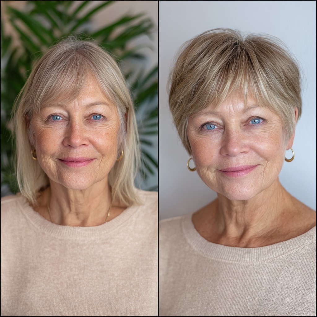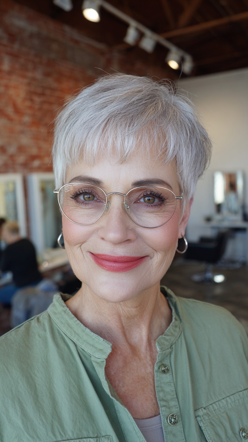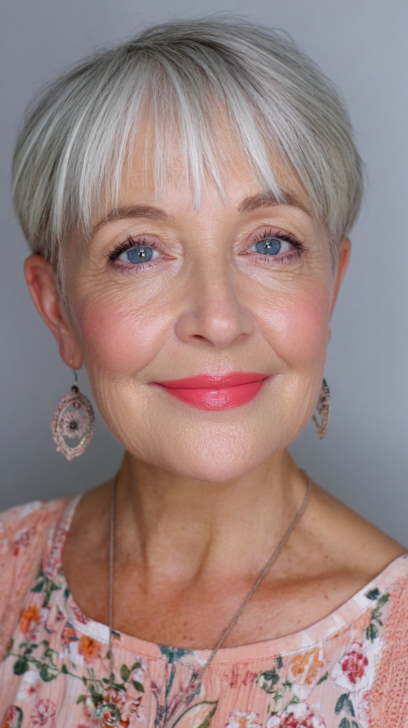 This textured silver pixie cut is perfect for mature women looking to refresh their style. The hair is cut to a short length, with soft bangs that beautifully frame the face, making it ideal for oval or heart-shaped faces. The model’s fine hair has a light density, giving it a breezy feel that’s easy to maintain. One unique aspect is the subtle layering that adds volume and movement, creating a lively look. Just keep in mind that lighter colors may require more upkeep, but the youthful appearance can be worth it!