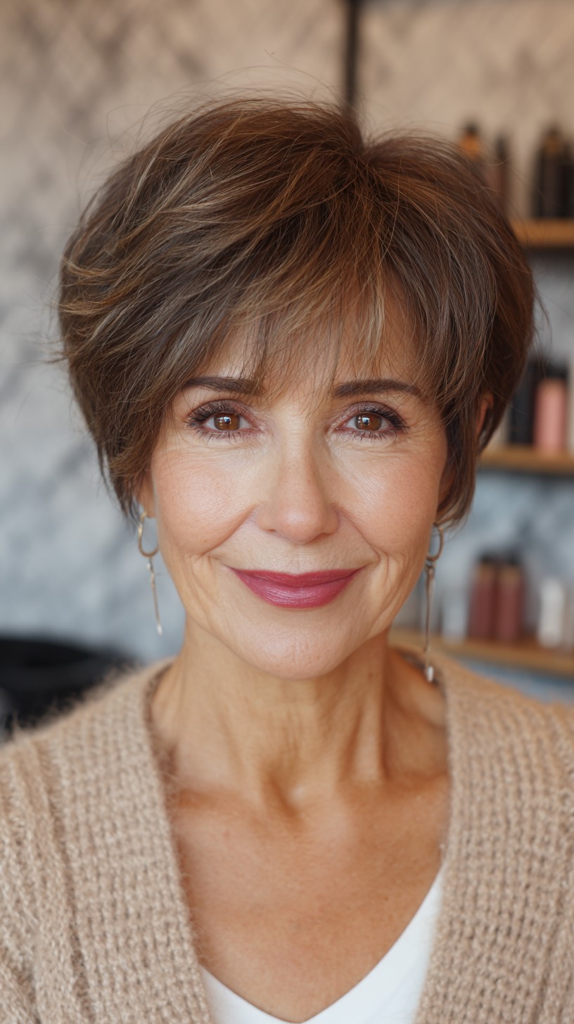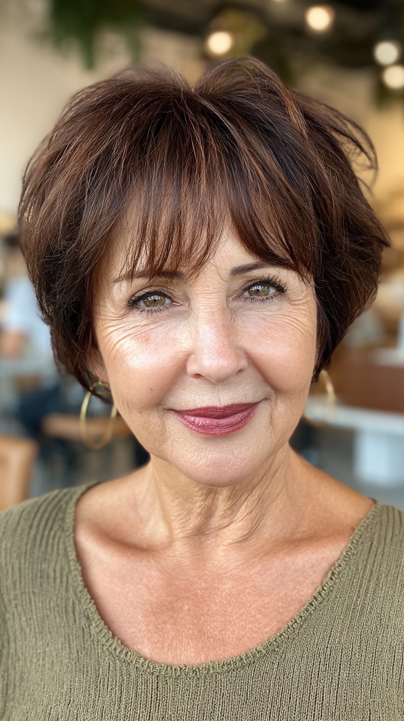 This stylish short cut features textured layers and soft bangs that beautifully frame the face. The hair appears to be fine to medium in density, allowing for a light, airy feel while maintaining a polished look. This cut is perfect for oval and heart-shaped faces, providing a youthful appearance. While it offers great versatility, keep in mind that regular maintenance is key to keeping those bangs in shape. The warm brown tones with subtle highlights add depth, making it a fantastic choice for adding warmth to your complexion.