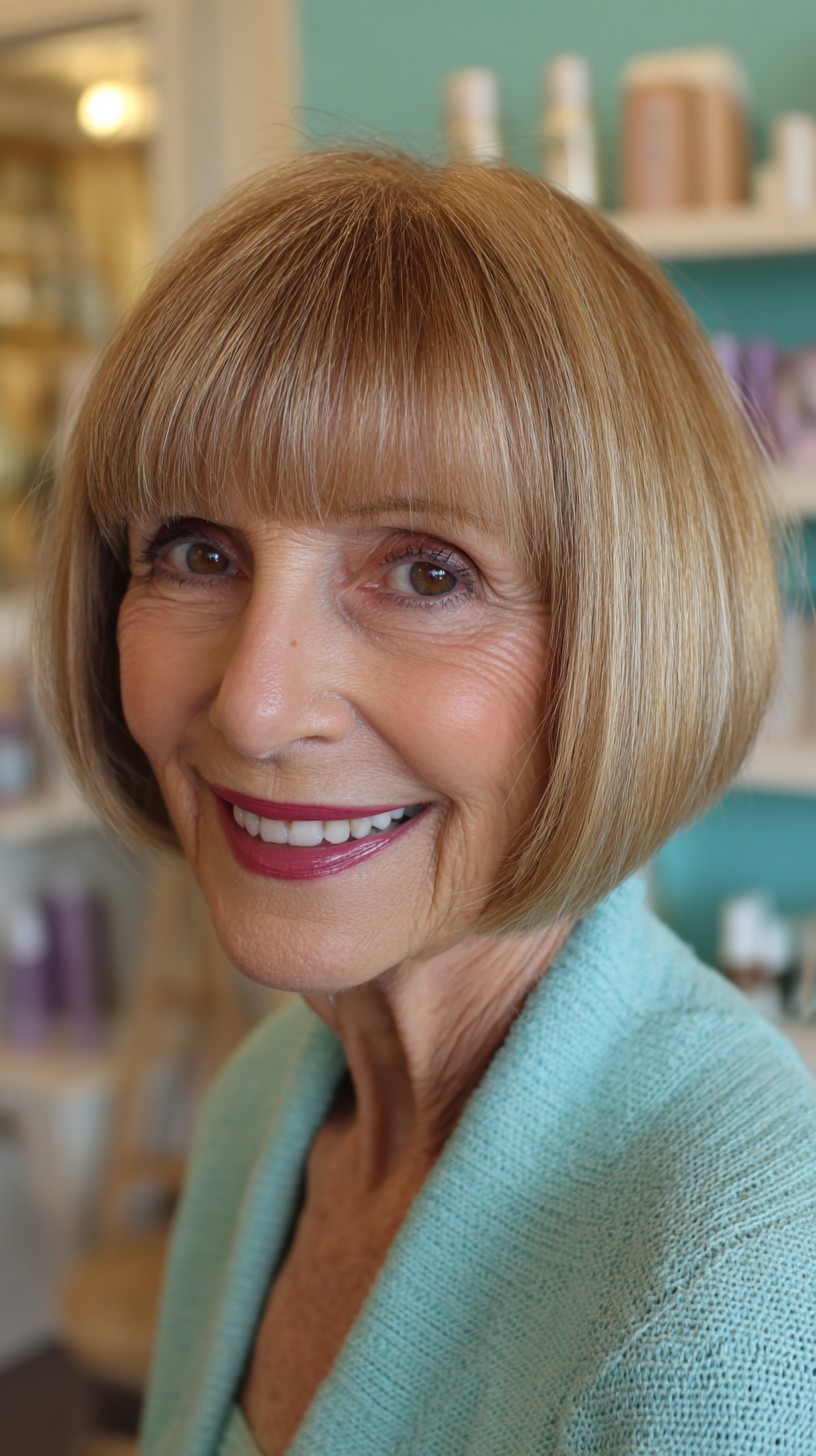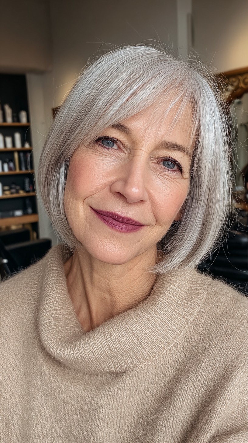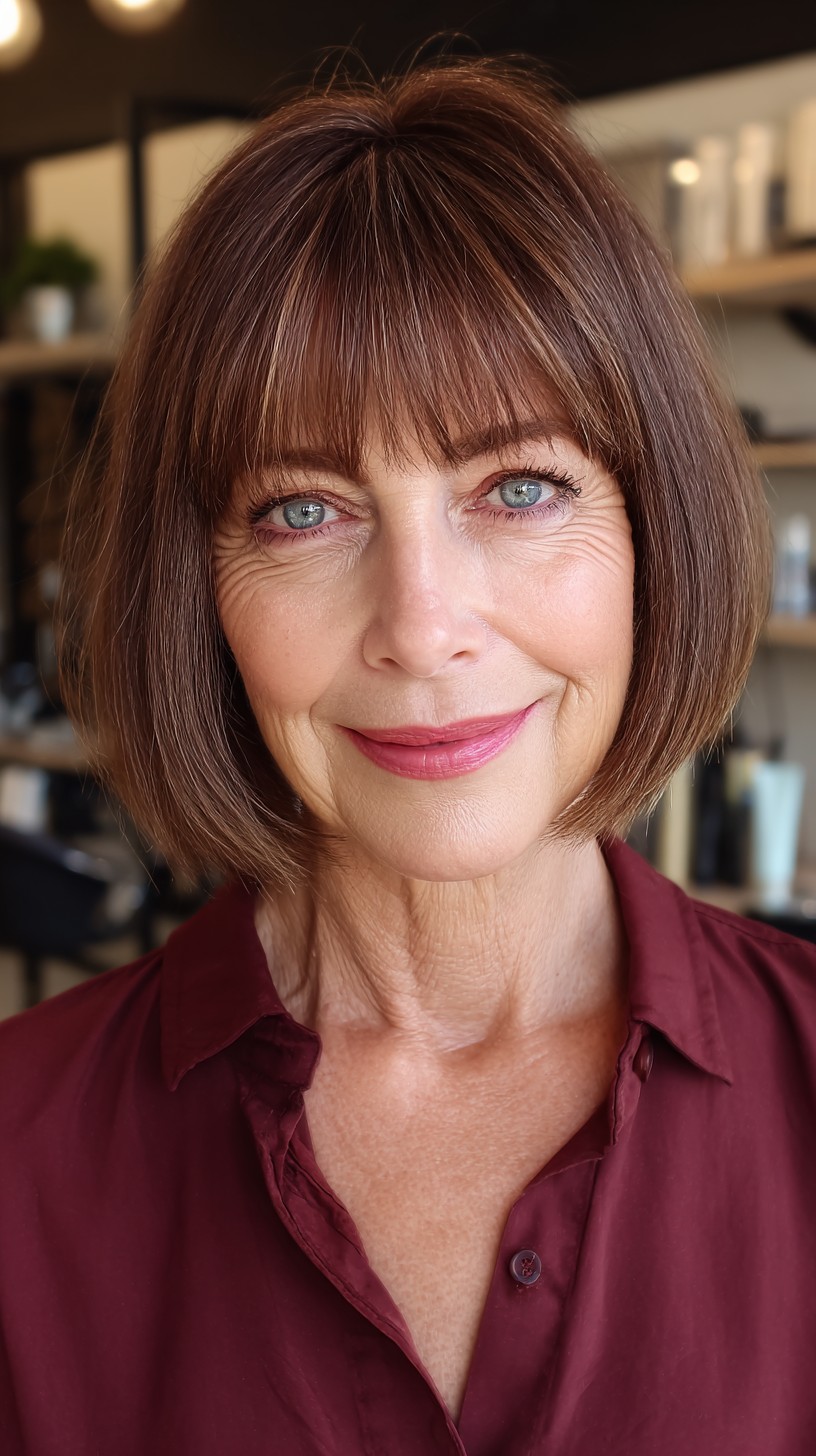 This classic blunt bob is perfect for adding volume to fine hair while offering a polished look for mature women. The soft bangs frame the face beautifully, enhancing facial features without overwhelming them. This cut works well on straight to slightly wavy hair types and suits various face shapes, particularly oval and heart. While it’s low-maintenance, it may require regular trims to keep that sharp edge. If you’re looking for a timeless style that exudes elegance and simplicity, this could be your next go-to!