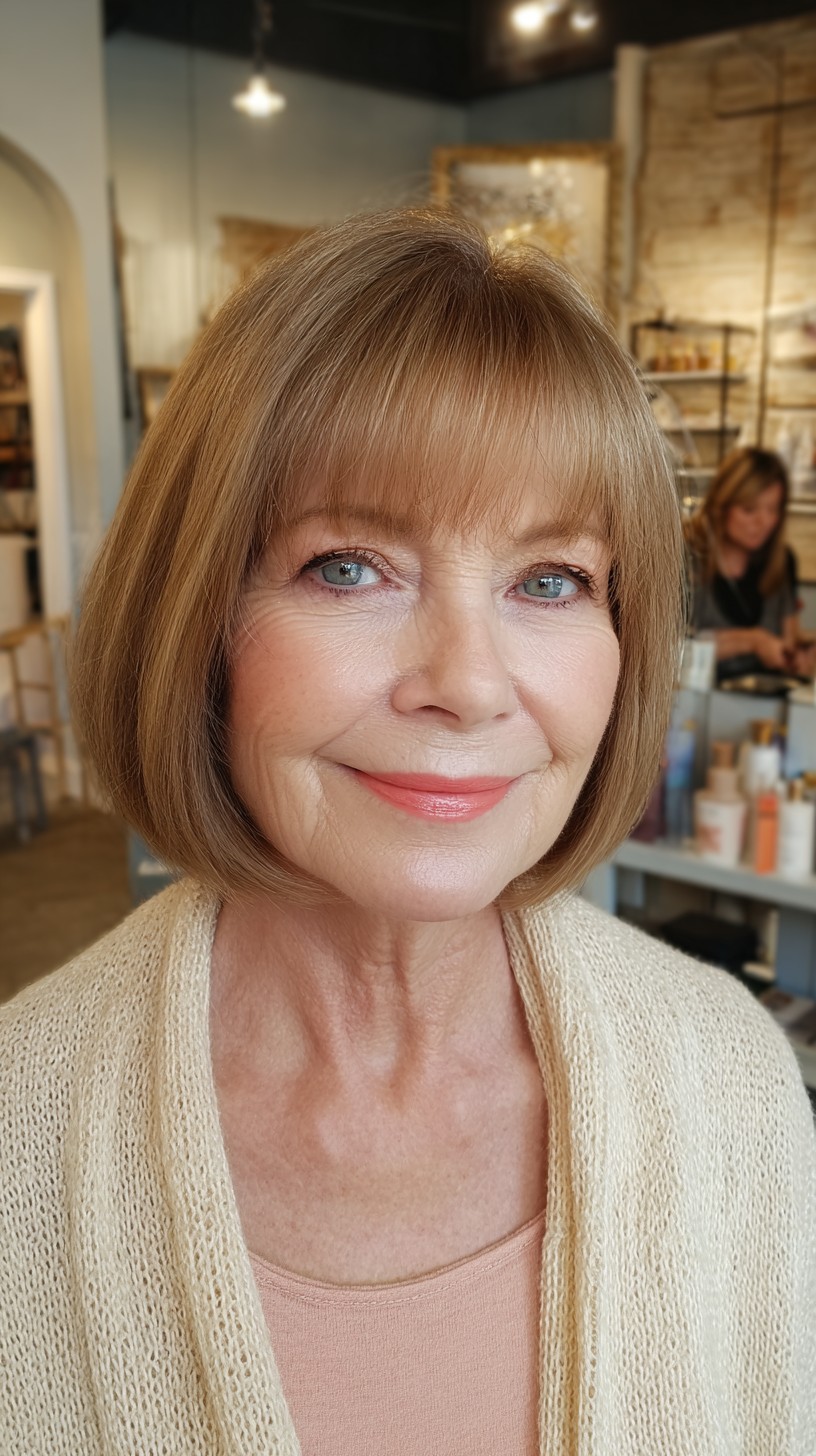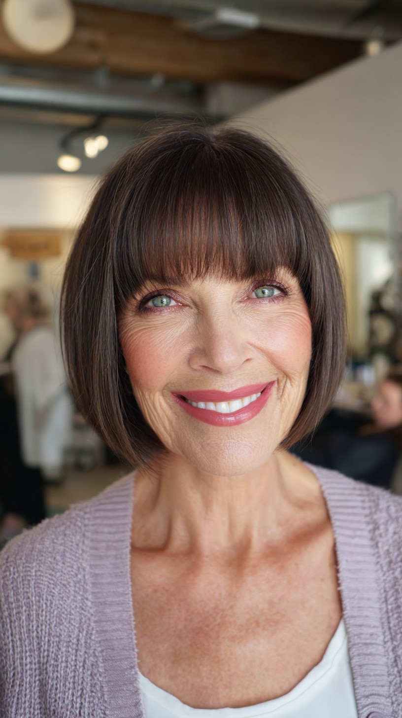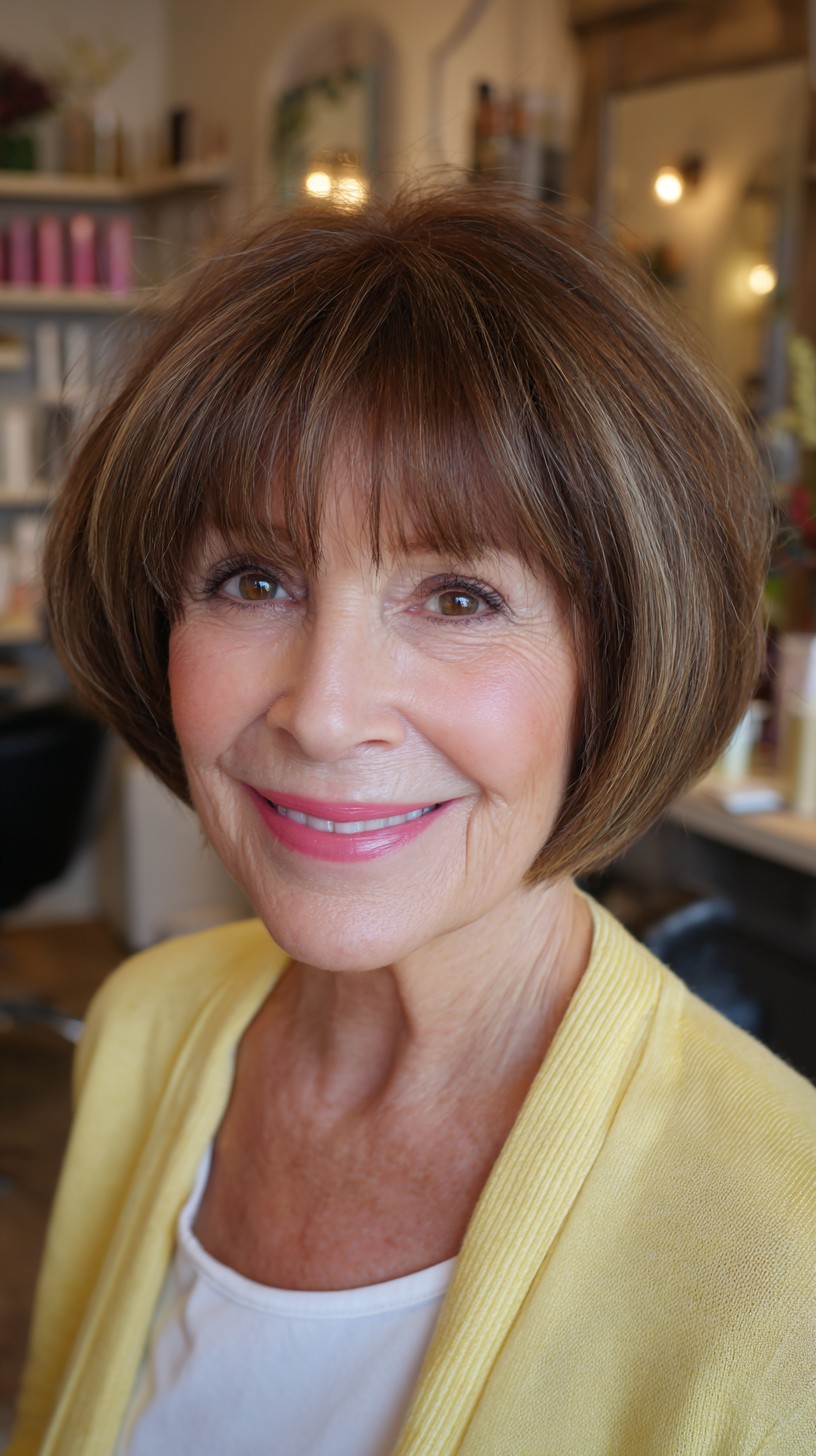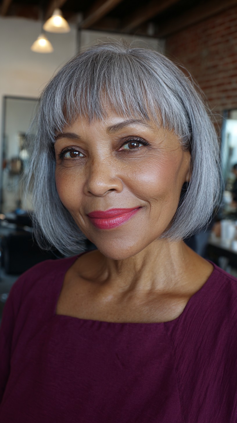 This classic blunt bob is perfect for adding volume to fine hair while offering a polished look for mature women. The soft bangs frame the face beautifully, enhancing facial features without overwhelming them. This cut works well on straight to slightly wavy hair types and suits various face shapes, particularly oval and heart. While it’s low-maintenance, it may require regular trims to keep that sharp edge. If you’re looking for a timeless style that exudes elegance and simplicity, this could be your next go-to!