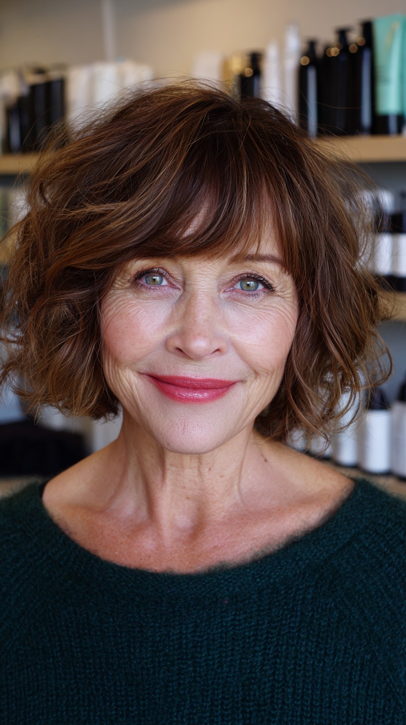 This textured wavy short cut features soft bangs that frame the face beautifully. The hair is cut to a length that grazes just above the jawline, making it ideal for those with oval or heart-shaped faces. The model’s fine hair density is enhanced with layered texturing, creating a fuller appearance. A unique aspect is the subtle highlights that add dimension, perfect for bringing warmth to a mature woman’s look. While this style is low-maintenance, it may require products to define those lovely waves.