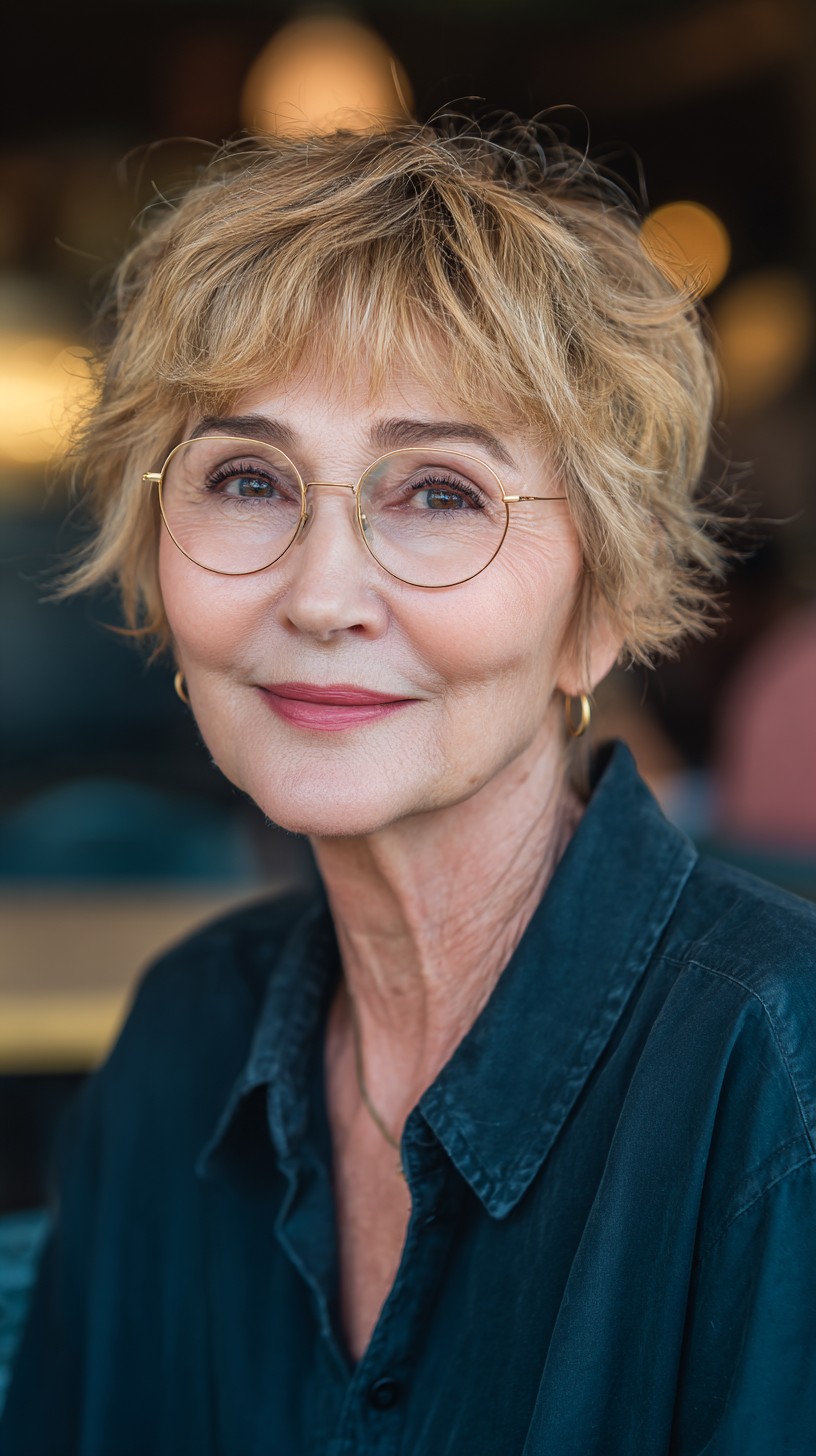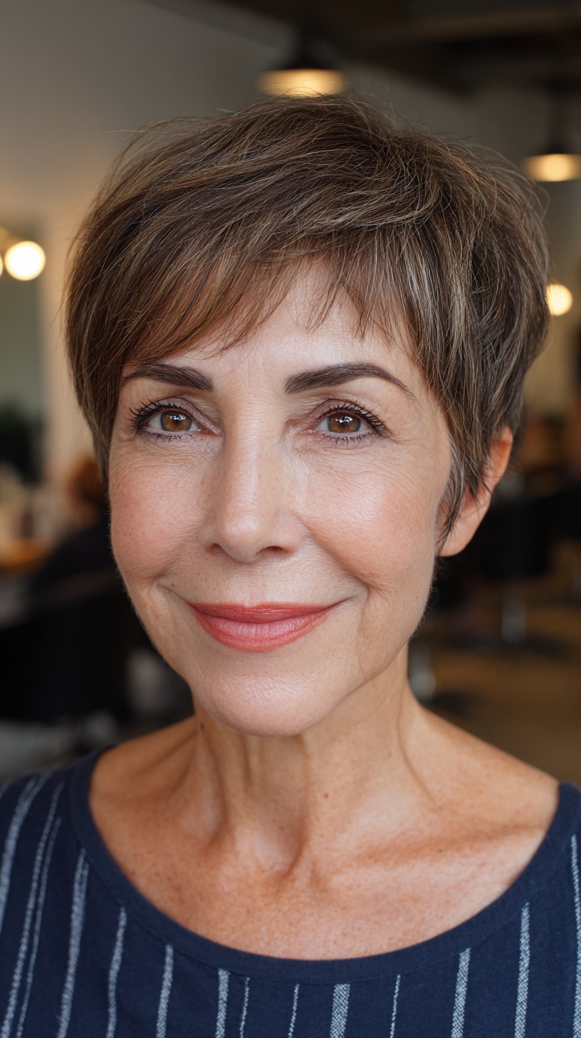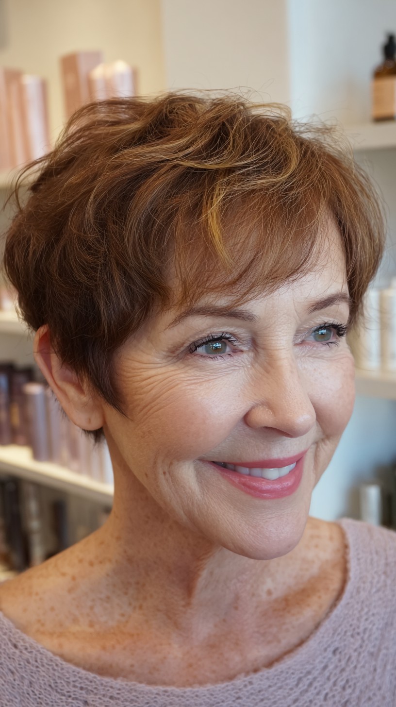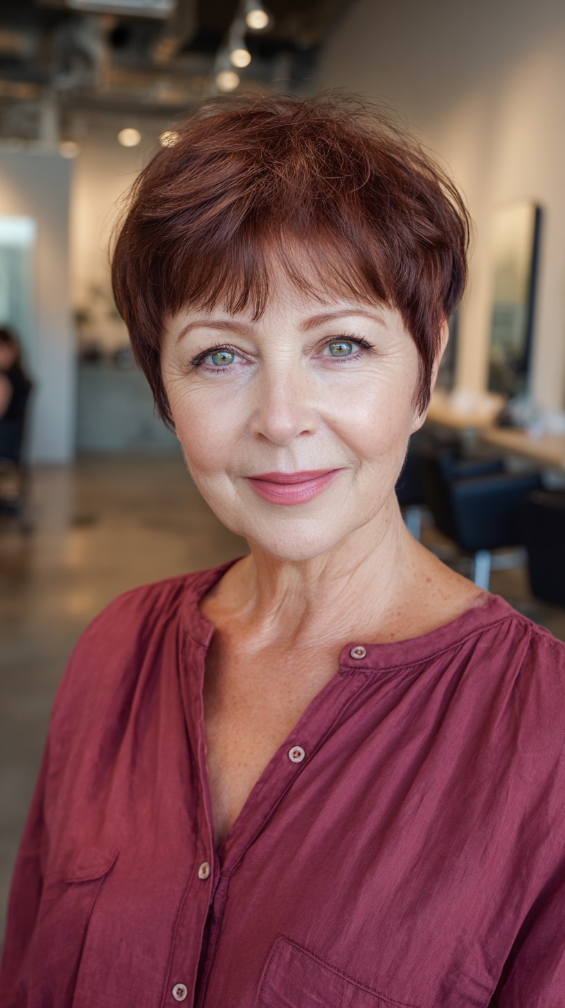 This textured short crop with soft bangs is perfect for those seeking a low-maintenance yet stylish look. The hair is cut to a short length, featuring layers that provide volume and movement, ideal for fine to medium hair types. The soft bangs gently frame the face, making it suitable for various face shapes, especially round and oval. However, keep in mind that this cut may require regular styling to maintain its shape. The tousled texture adds a youthful charm, making it perfect for mature women looking for a fresh change.