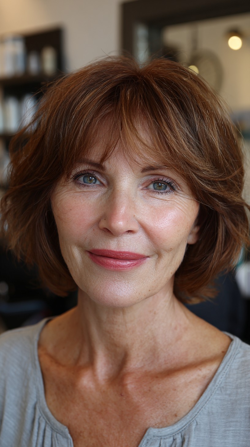 This charming textured short cut with soft bangs is perfect for a fresh look. The hair length is just above the shoulders, offering a youthful appearance. The layered texture adds volume, making it suitable for fine to medium hair density, while the soft bangs frame the face beautifully, ideal for heart or oval face shapes. While this style is low-maintenance, it may require regular trims to keep those bangs in shape. The warm reddish-brown hue adds dimension, enhancing the overall brightness of your complexion.