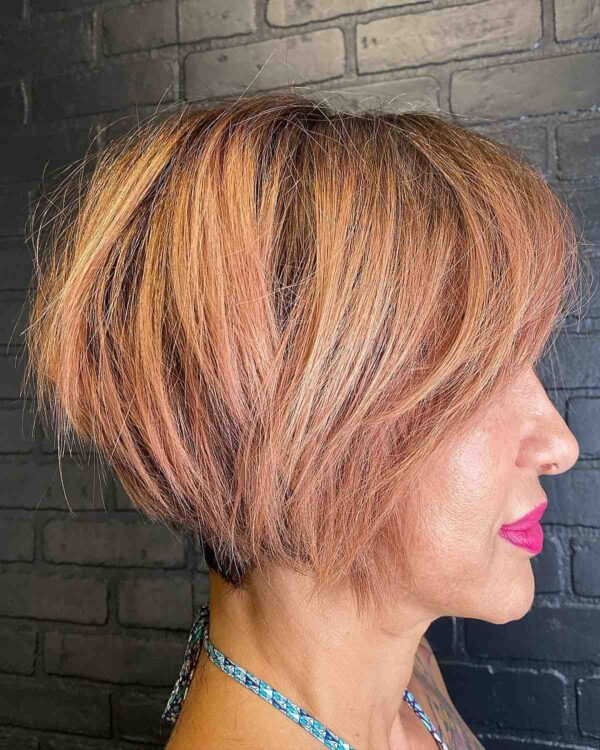 These textured ends and bangs complement each other beautifully, adding depth and character to a classic blonde cut. It’s perfect for those who prefer low-maintenance styling, as a quick straightening is all that’s needed to achieve this stunning look. Explore more short hairstyles with fringe.