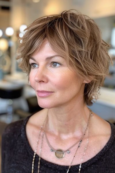 This messy hairstyle is a textured pixie that’s striking yet also graceful. It’s suitable for a variety of hair types and provides a low-maintenance option for women who prefer to minimize their hair styling routine.