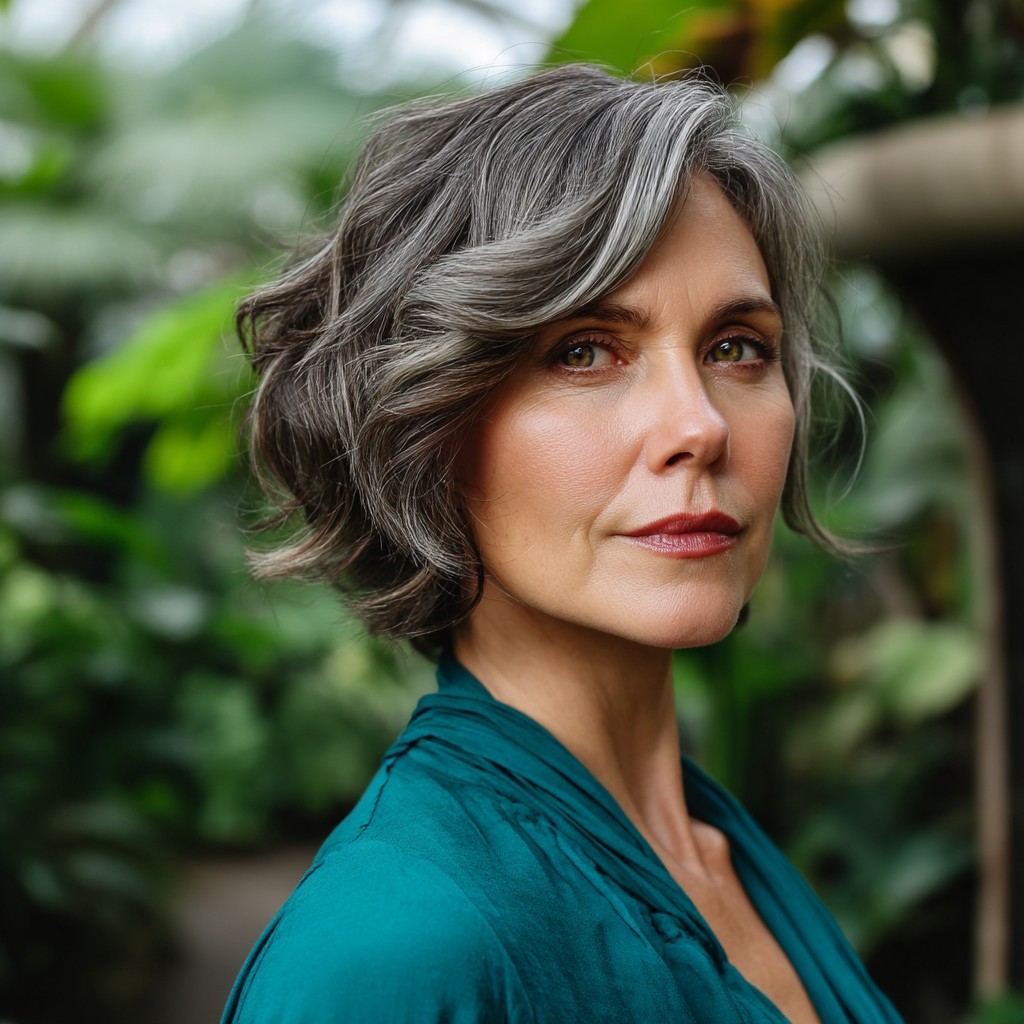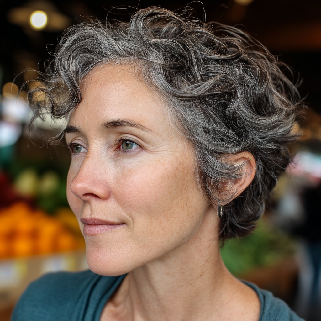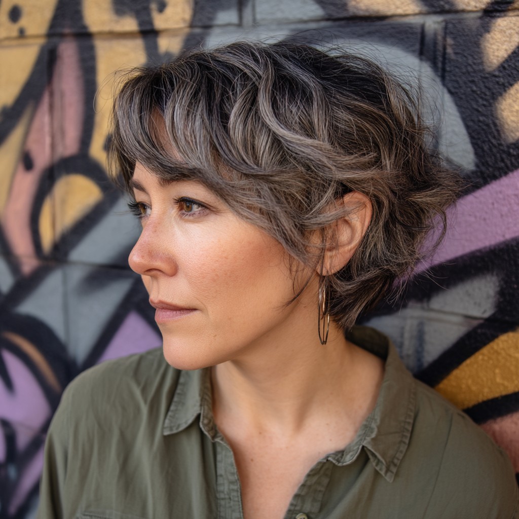 This lovely cut features short, wavy layers that enhance natural texture and movement. The soft curls frame the face beautifully, making it a great option for oval or heart-shaped faces. The model’s fine hair density and natural gray highlights add a unique charm, offering a stylish yet low-maintenance look. Consider this cut if you want something that’s both modern and easy to style, but keep in mind that it might require some product to maintain that bouncy definition.