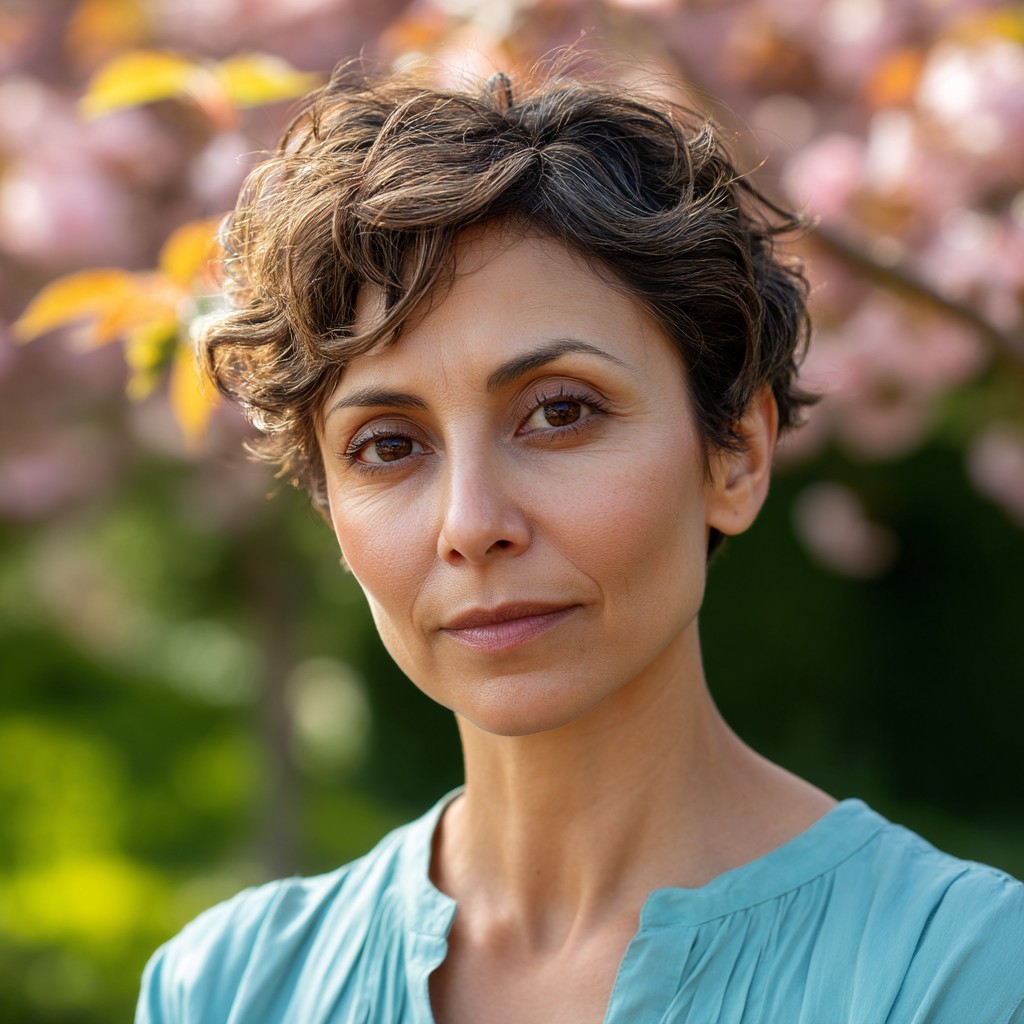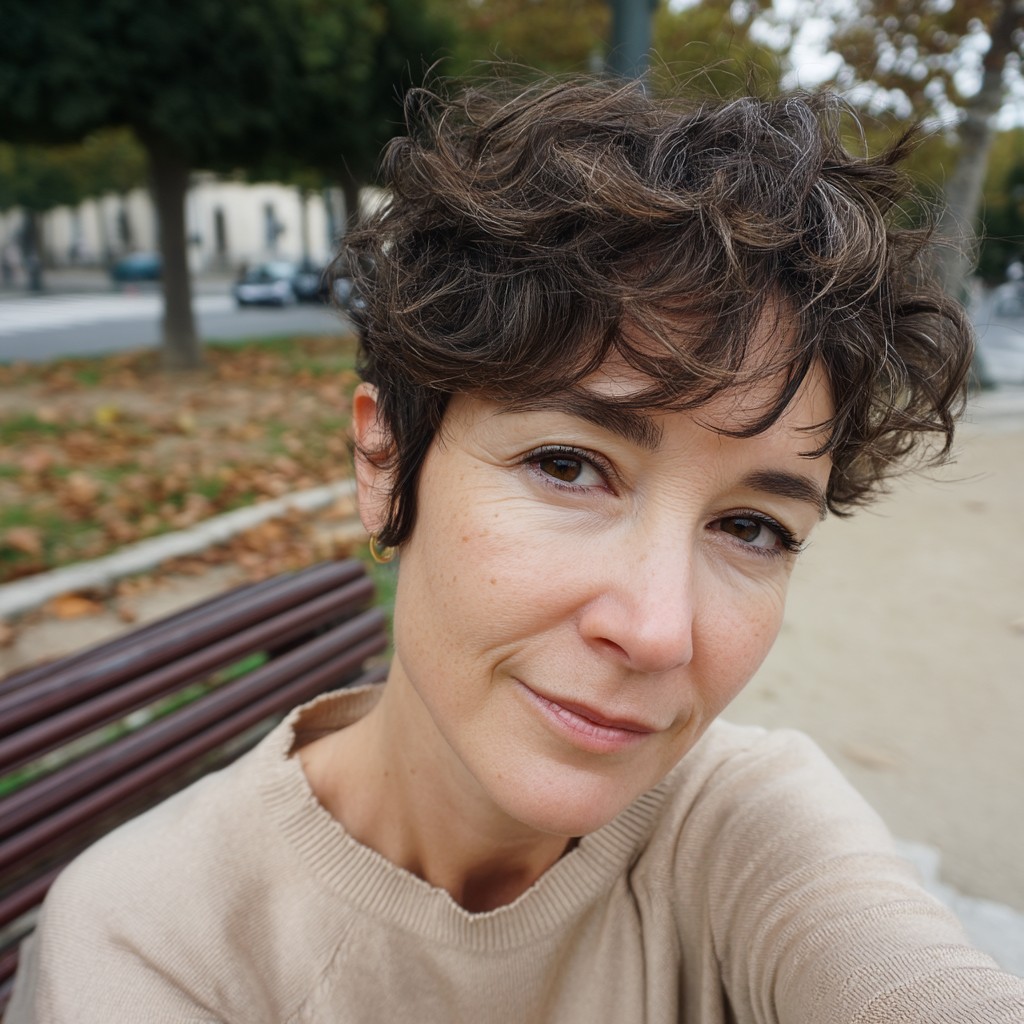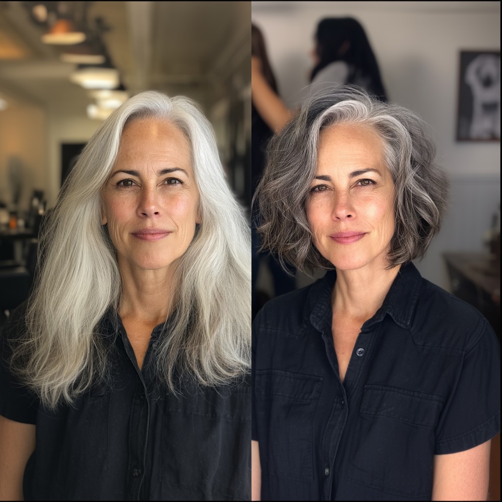 This lovely cut features short, wavy layers that enhance natural texture and movement. The soft curls frame the face beautifully, making it a great option for oval or heart-shaped faces. The model’s fine hair density and natural gray highlights add a unique charm, offering a stylish yet low-maintenance look. Consider this cut if you want something that’s both modern and easy to style, but keep in mind that it might require some product to maintain that bouncy definition.