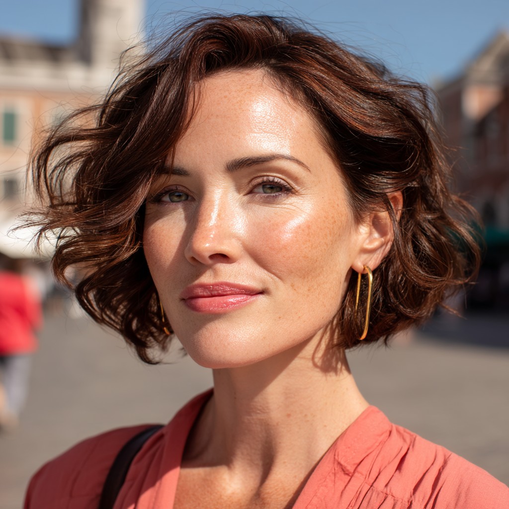 This chic short wavy bob features beautifully textured ends that add dimension and movement, ideal for those with medium to fine hair density. The playful waves frame the face nicely, making it suitable for various face shapes, especially oval and heart-shaped. The warm brown color enhances the natural shine and works well with a variety of skin tones. Just keep in mind, if your hair is thicker, you’ll want to consider layering to avoid bulk. This cut is low-maintenance but may require some styling products to define the waves.