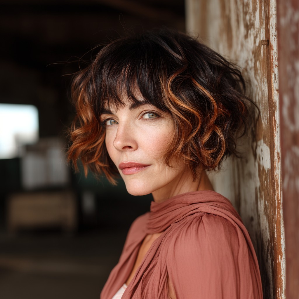 This chic textured wavy bob is perfect for those looking to embrace their natural curls. The length falls just above the shoulders, giving a light and playful feel. The soft layers add movement, while the tousled waves create a relaxed, effortless look. Ideal for fine to medium hair density, this cut flatters oval and heart-shaped faces beautifully. One unique aspect is the subtle balayage highlights that enhance the waves and add depth without overwhelming the style. It’s low-maintenance yet offers a fresh look that can easily transition from day to night.