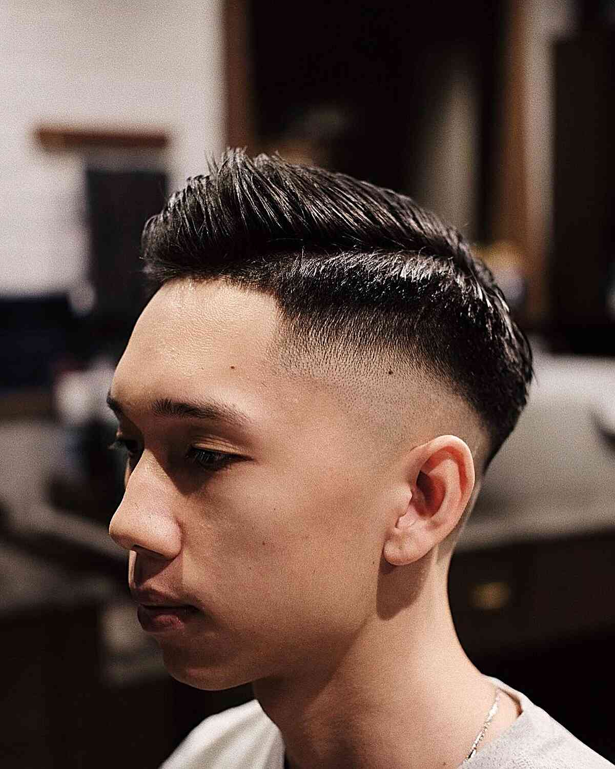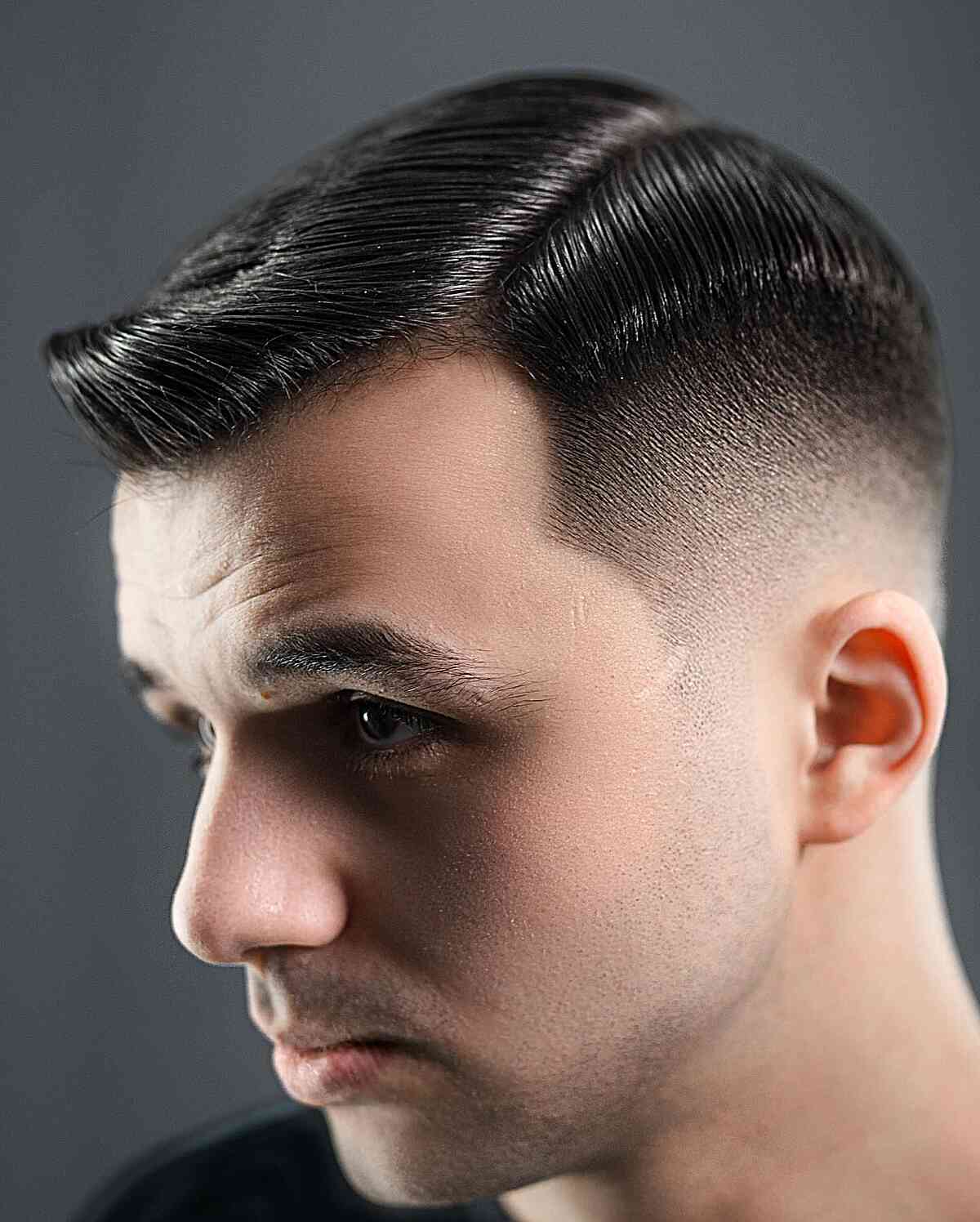 An Ivy League haircut featuring a hard part can be embraced by men of all ages from various backgrounds. The fade is taken down to the skin around the ears and transitioned neatly into the top, cutting in a hard part. Relatively simple to maintain, a quick blow over with a dryer, and a pomade to keep the style intact for the day, are the essentials that you need.