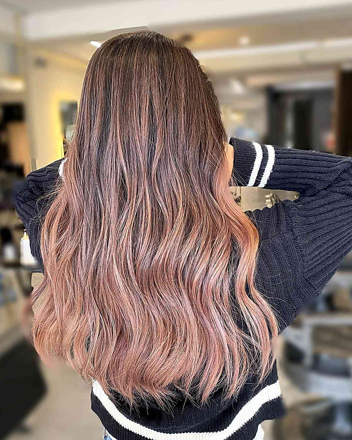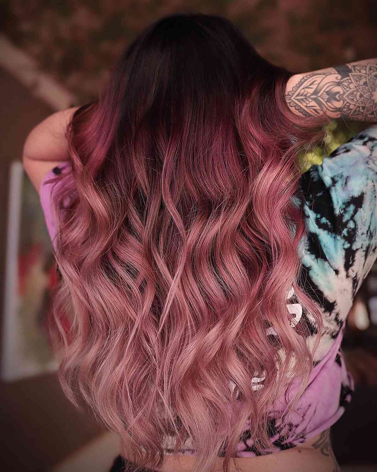 This soft rose ombre showcases a beautiful blend of tones and levels, creating a delicate flow from top to bottom. A warm base seamlessly transitions into a coppery pink mid-shaft and concludes with a gentle pink at the ends. During your consultation, ask your stylist about the maintenance needed for a style and color like this one. The soft rose shade should be refreshed monthly to maintain the vibrancy and integrity of the ombre hair colors. Using a color-conserving shampoo and conditioner can help prolong the color’s life between services. This color service may not suit women with low-maintenance hair goals. The time and financial investment required to maintain long hair with ombre hair color can be overwhelming for some.