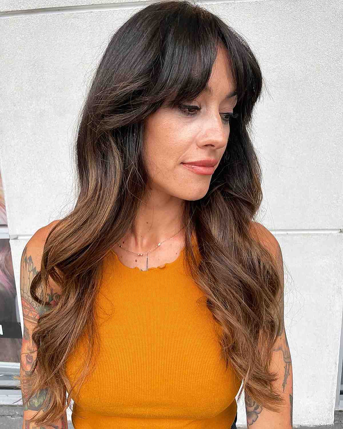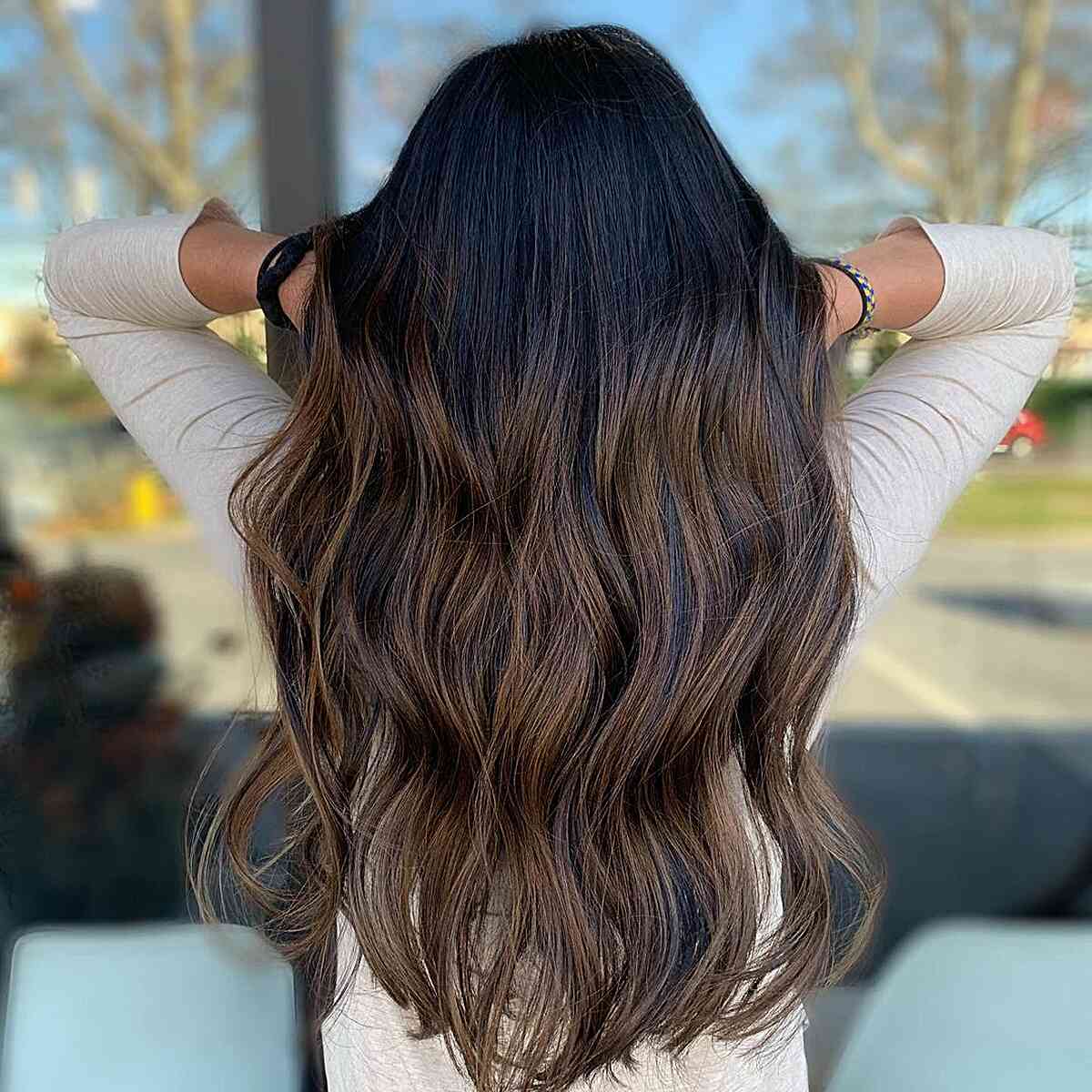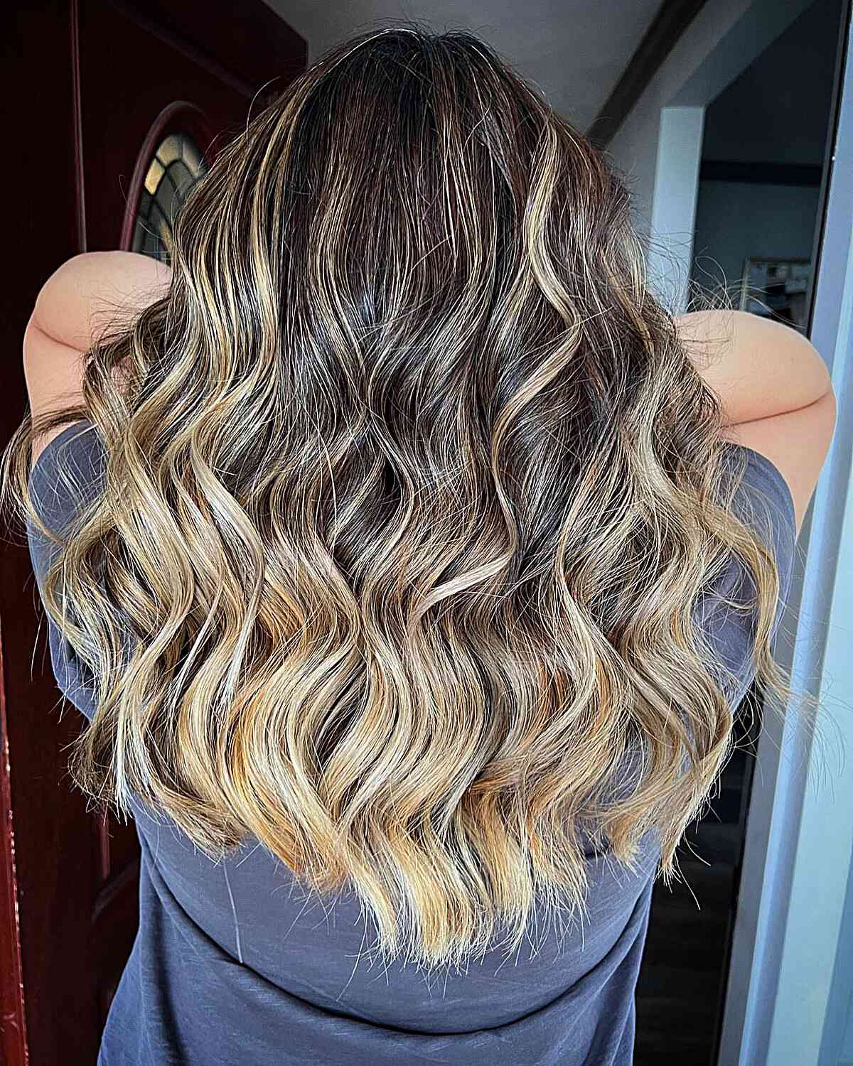This style showcases a contemporary approach to ombré. When ombré debuted, it featured a striking contrast from dark to light, marked by a distinct line dividing the two shades. Nowadays, everyone prefers a smoother gradient from natural hues to a blonde finish. The rich brown tones at the ends lend a more organic and textured look to the ombré.
