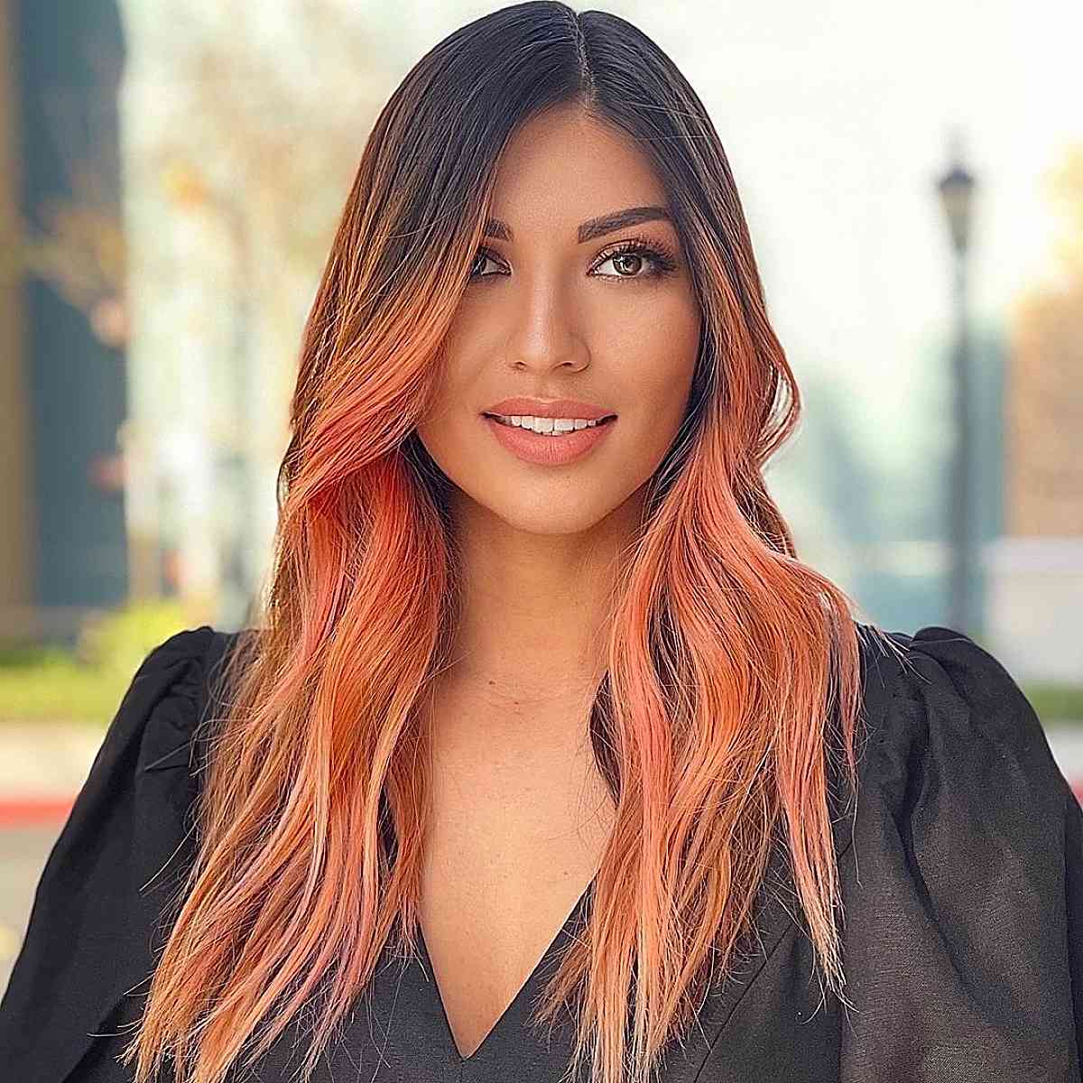 A peach ombre long hairstyle like this means color touch-ups every 4 weeks, but you enjoy less maintenance on the bleach due to the ombré! Most ombrés can go a year or more without a bleach touch-up. Peachy ombrés can complement various women because you retain your natural color alongside a youthful and chic fashion color on the tips.