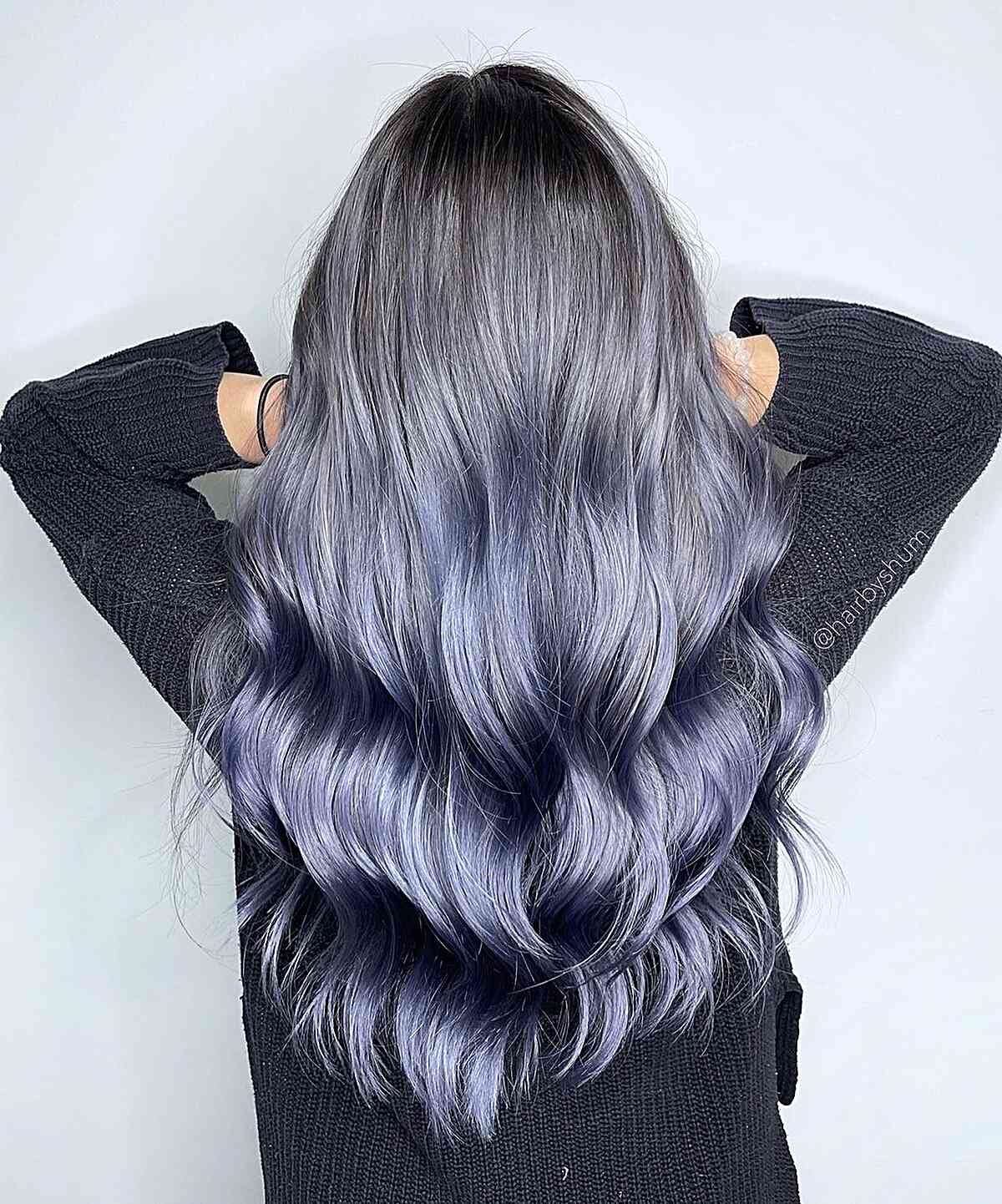 Naturally, dark-brown/black Asian hair takes multiple sessions to create a clear, silvery blonde foundation. Ask your stylist to develop a wonderfully light and healthy base so that any toner applied will fade gracefully over time. This metallic blue would be ideal for silver undertones. Although the shades from root to tip are of high contrast, they harmoniously blend into one another.