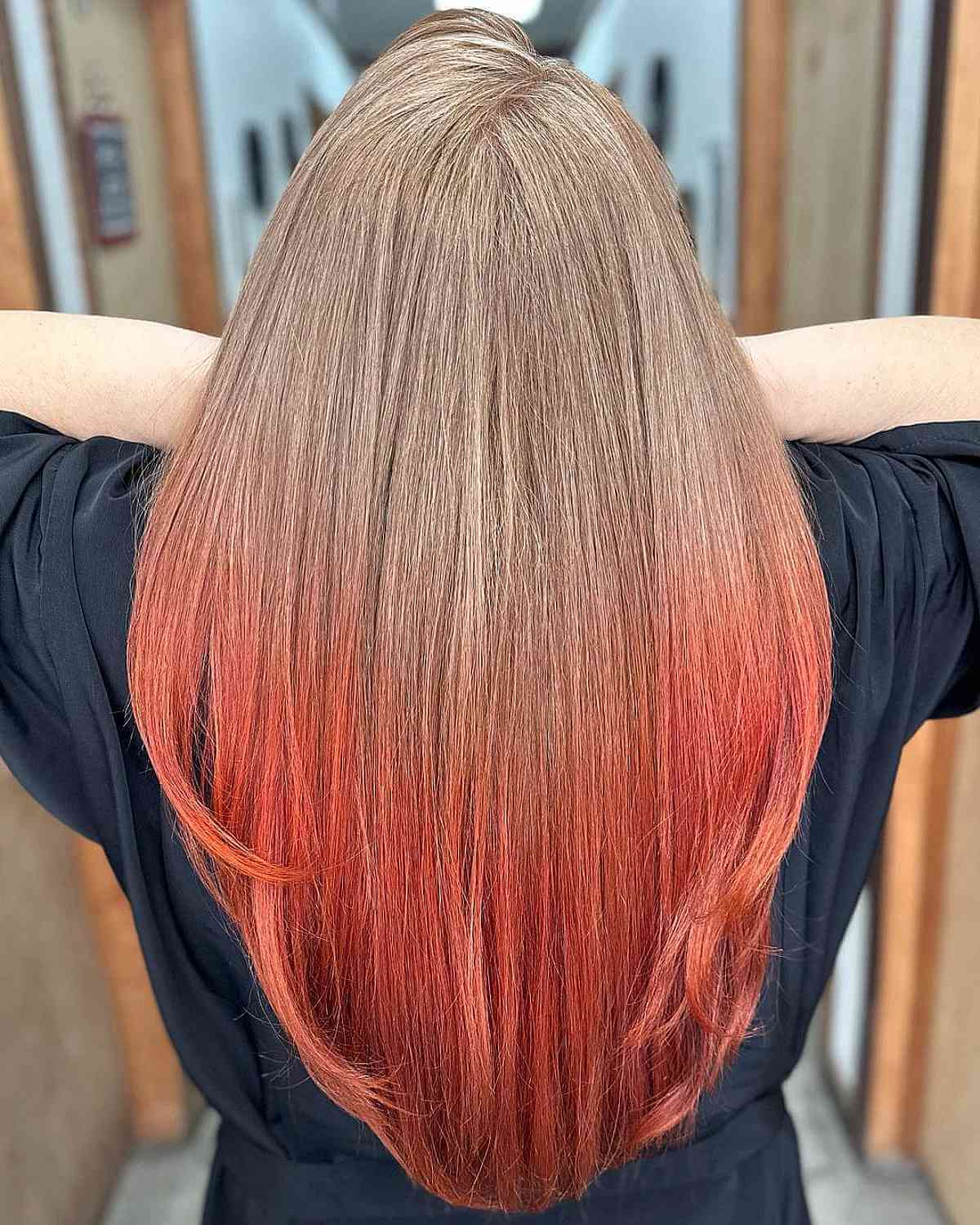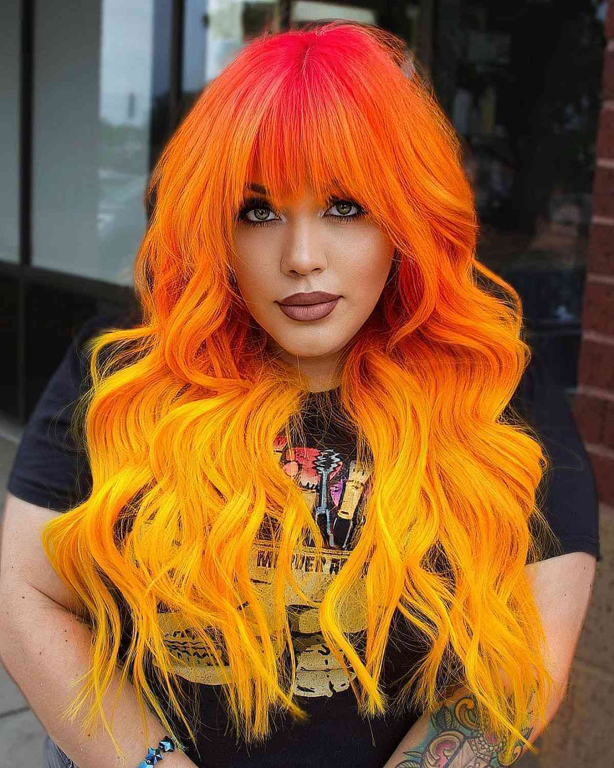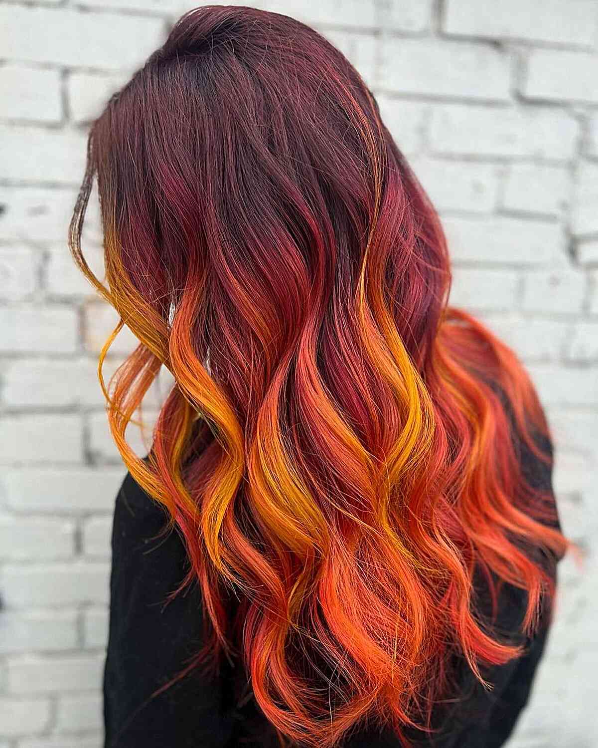 To elevate your style, you should choose the eye-catching deep crimson roots to luminous orange tips ombre color. This coloring technique begins with a rich crimson base that seamlessly transitions to radiant orange at the tips. The luxurious crimson and bright orange contrast provides depth and dimension to your hair. This ombre look is perfect for a variety of hair lengths and textures. Whether your hair is straight, wavy, or curly, this color combination is sure to attract attention.