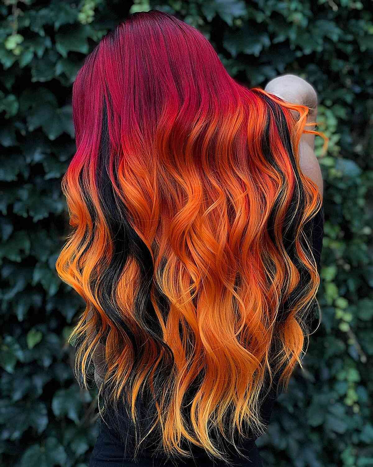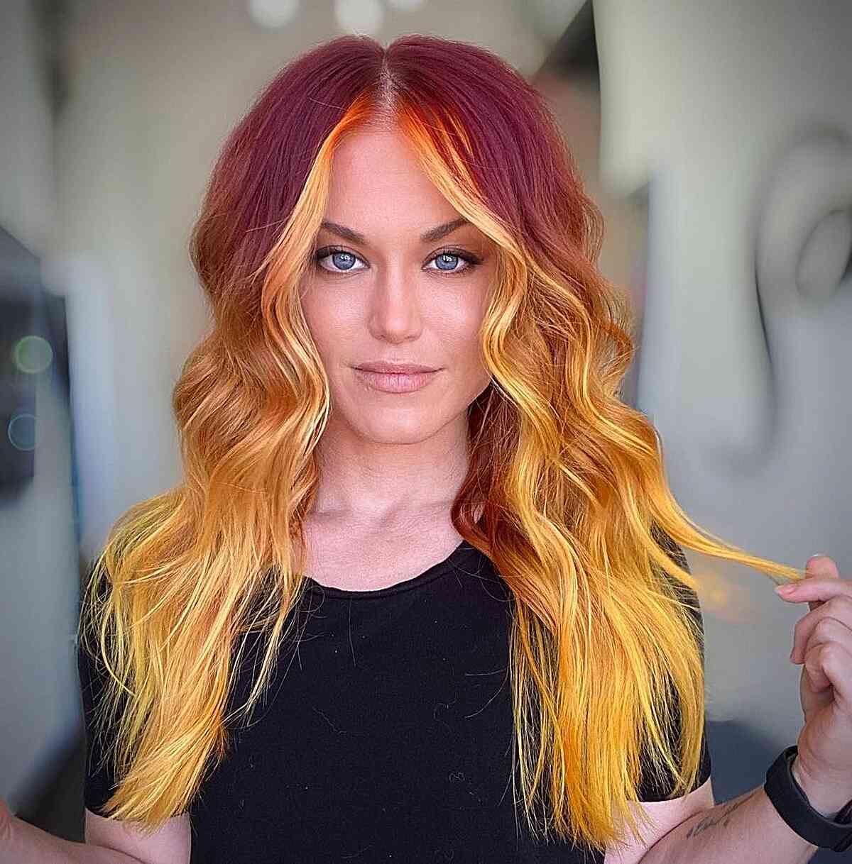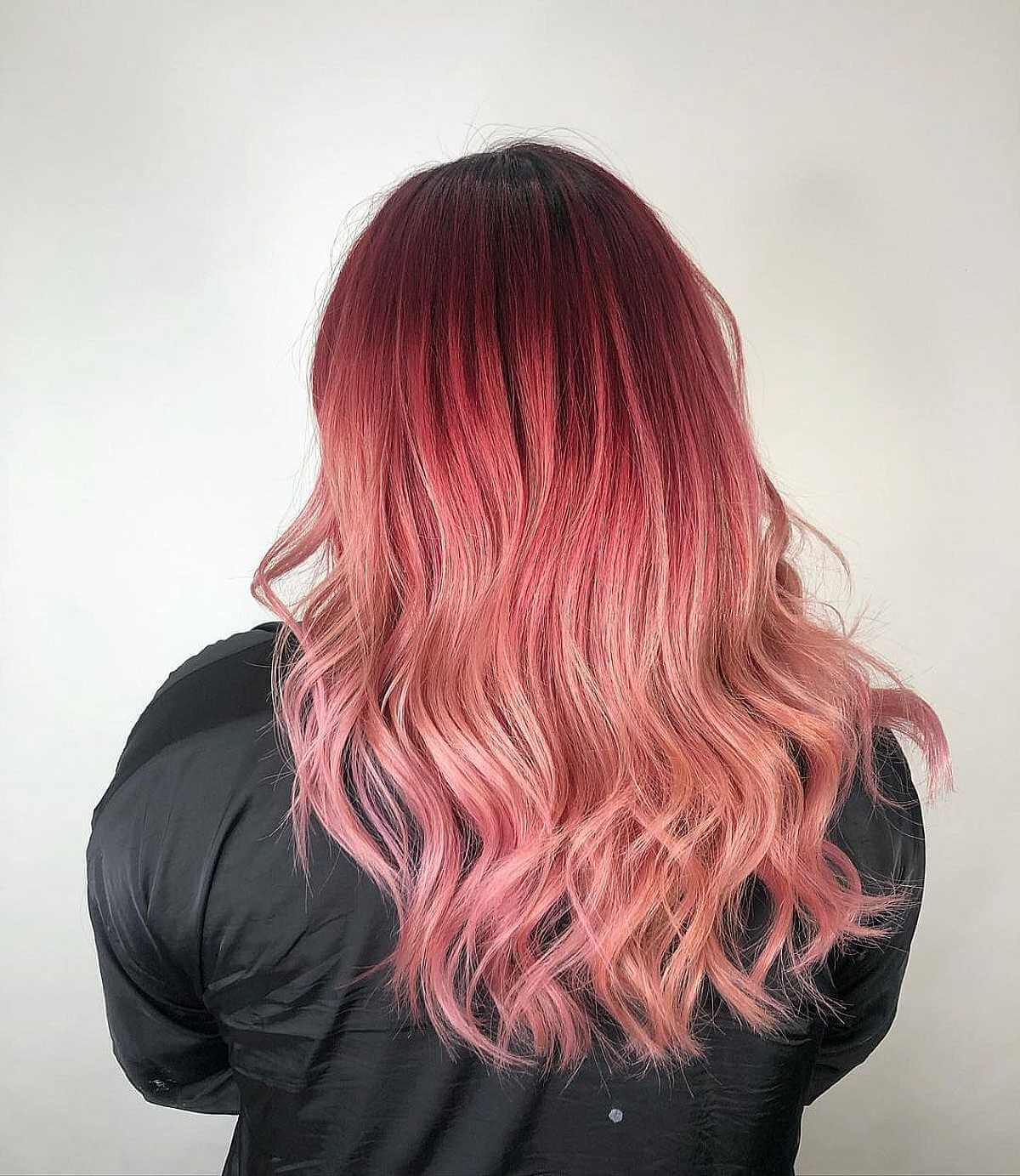 Here’s another striking ombre. It begins with black at the roots and swiftly transitions to vibrant red. Cool medium skin tones with hair that naturally has black roots and medium texture is perfect for this look. You might not need frequent salon visits for retouches if you keep your roots untouched, but you may need to have the lighter sections re-toned. If regular visits are not something you prefer, be sure to inform your stylist during your consultation.