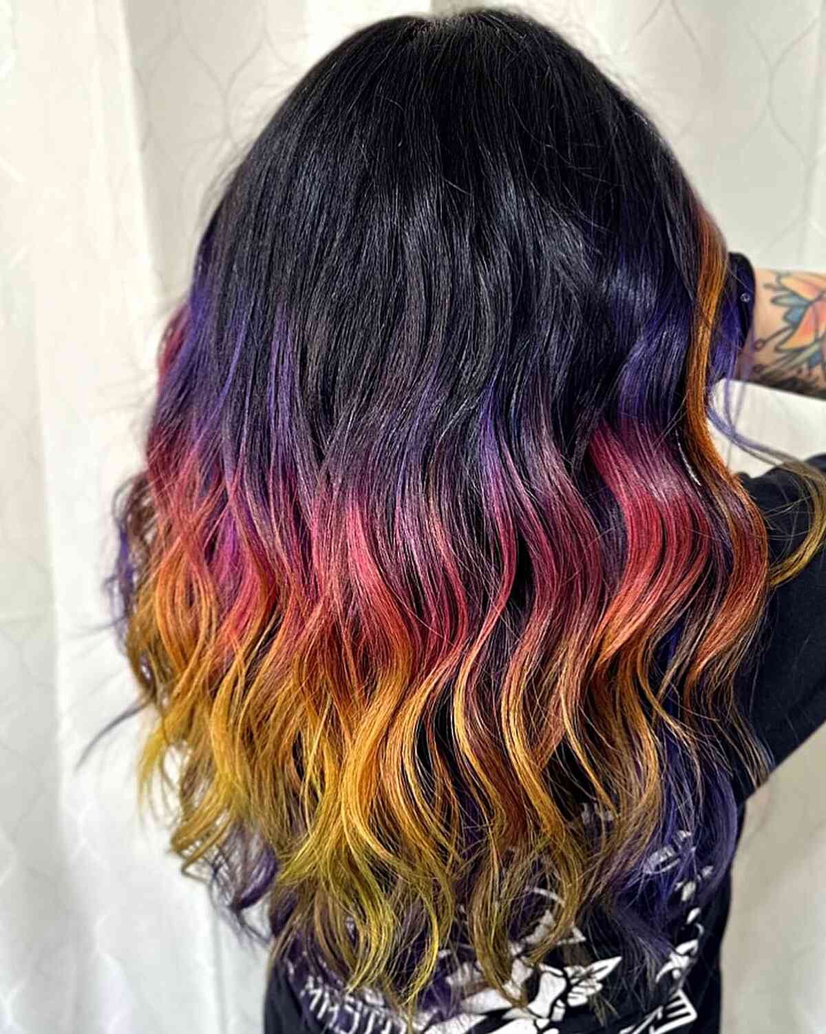 One of the best ways to sport a long ombre is with vibrant rainbow hues. This technique, rich and distinctive, mirrors an oil slick or a piece by Lisa Frank.