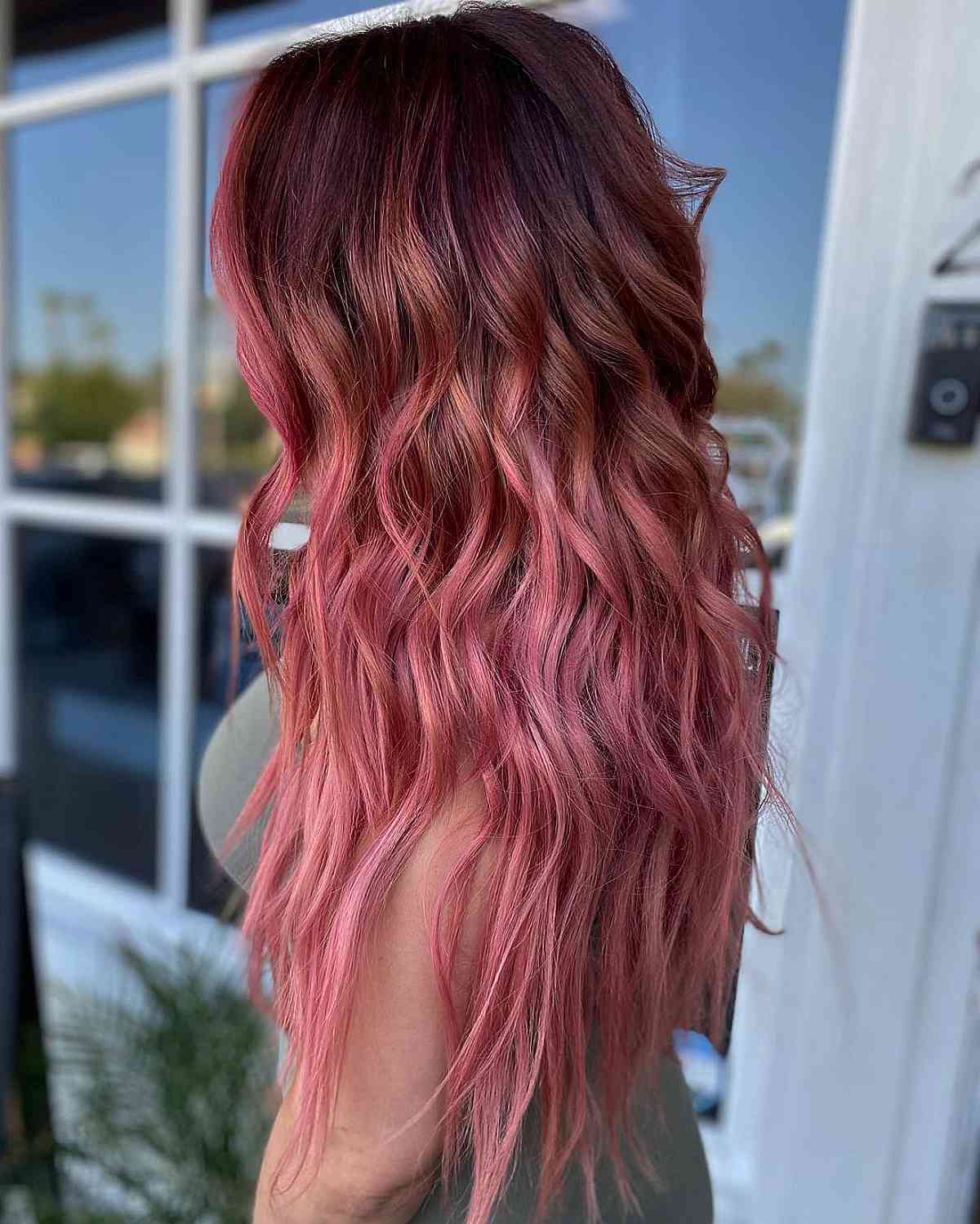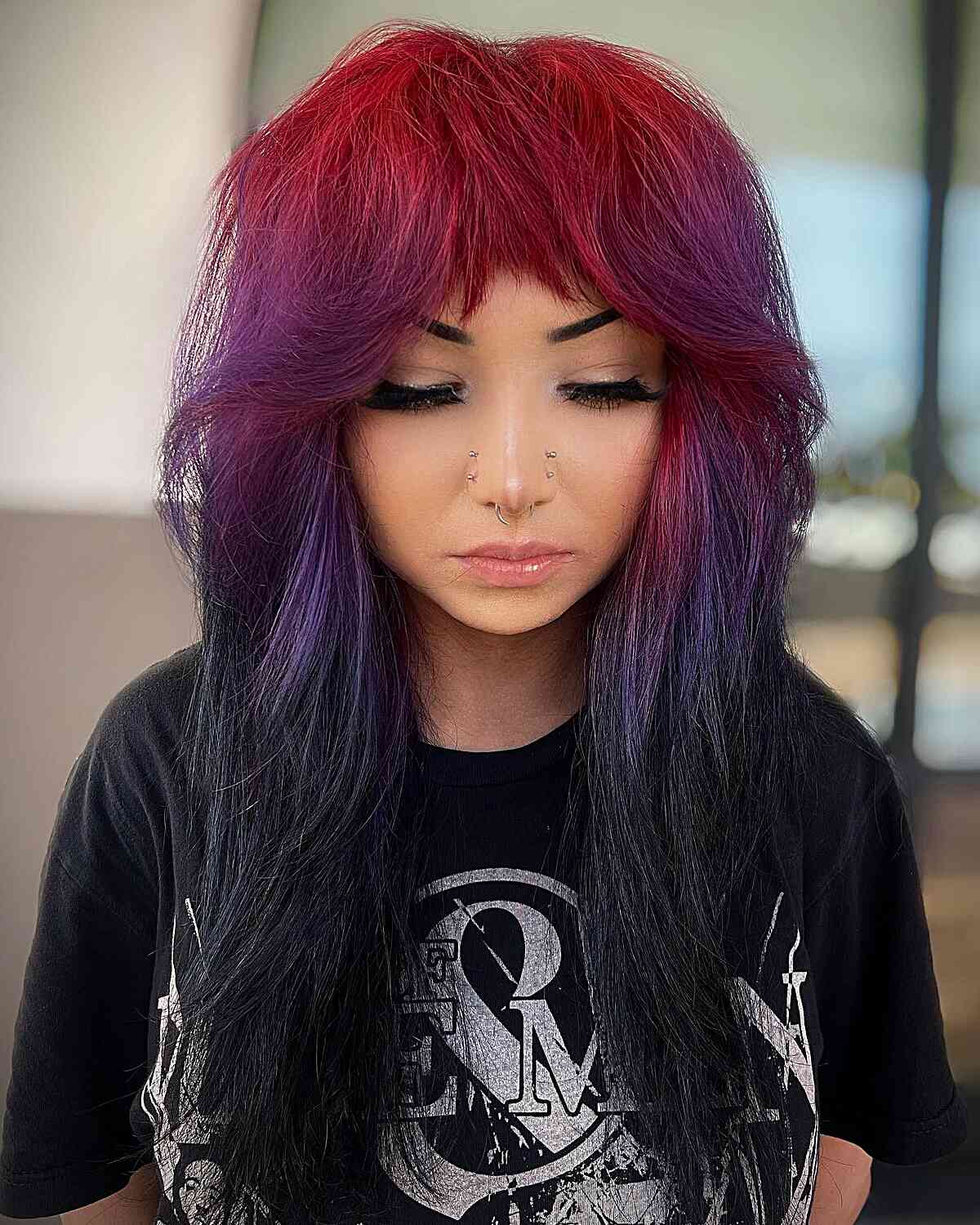 This is a stunning violet ombré featuring a vibrant red “camera flash” or “diffused” shine line. It transitions smoothly from a rich violet root into a vivid ombré and then back into violet at the tips. Consider the level of maintenance you’re ready to undertake. You’ll need to refresh the red regularly with an ombre as striking as this one because it will fade. The violets also tend to diminish to a brown hue. The wonderful aspect of this long layered look is its ability to deliver easily attainable volume suitable for any face shape.