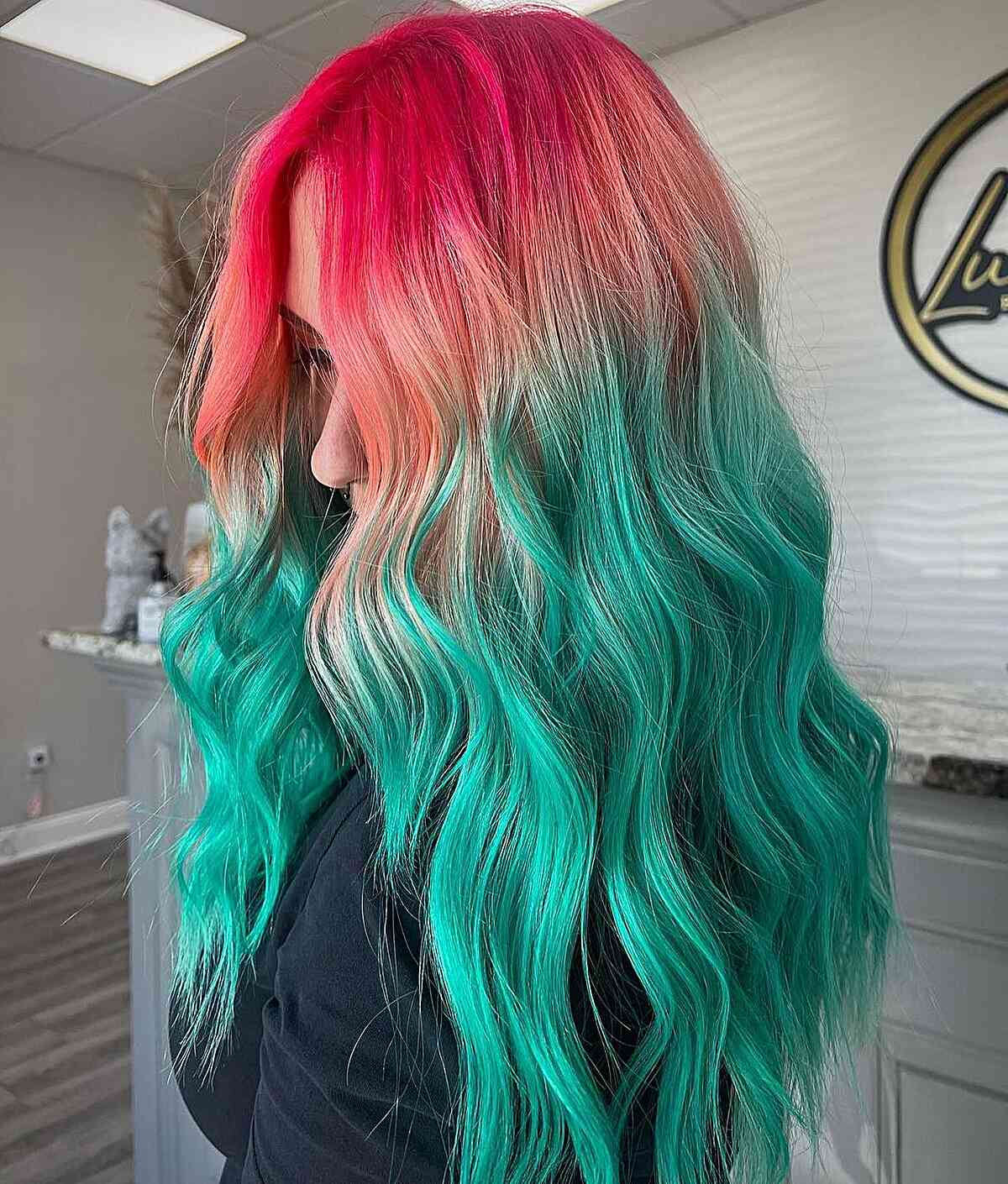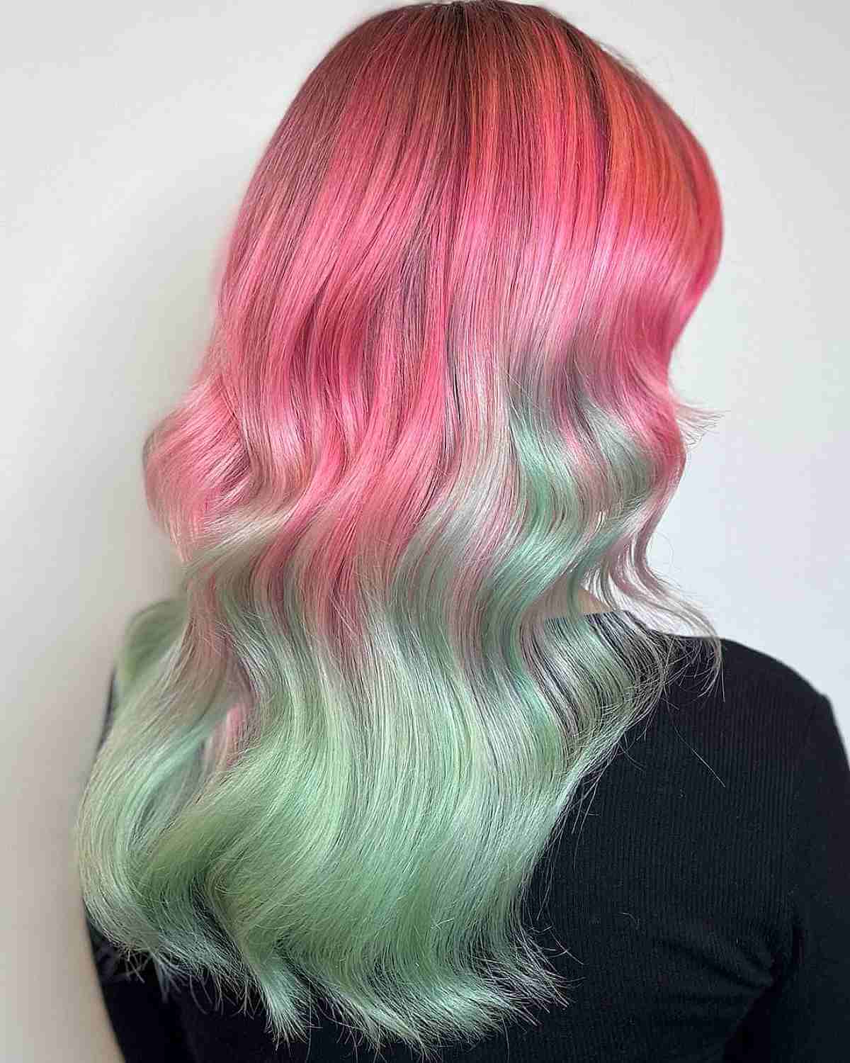 Are you prepared to flaunt this stunning pink-to-green ombre hair color? This color melted hair radiates gorgeous watermelon vibes. Wearing your hair in waves will enhance this melted work of art!