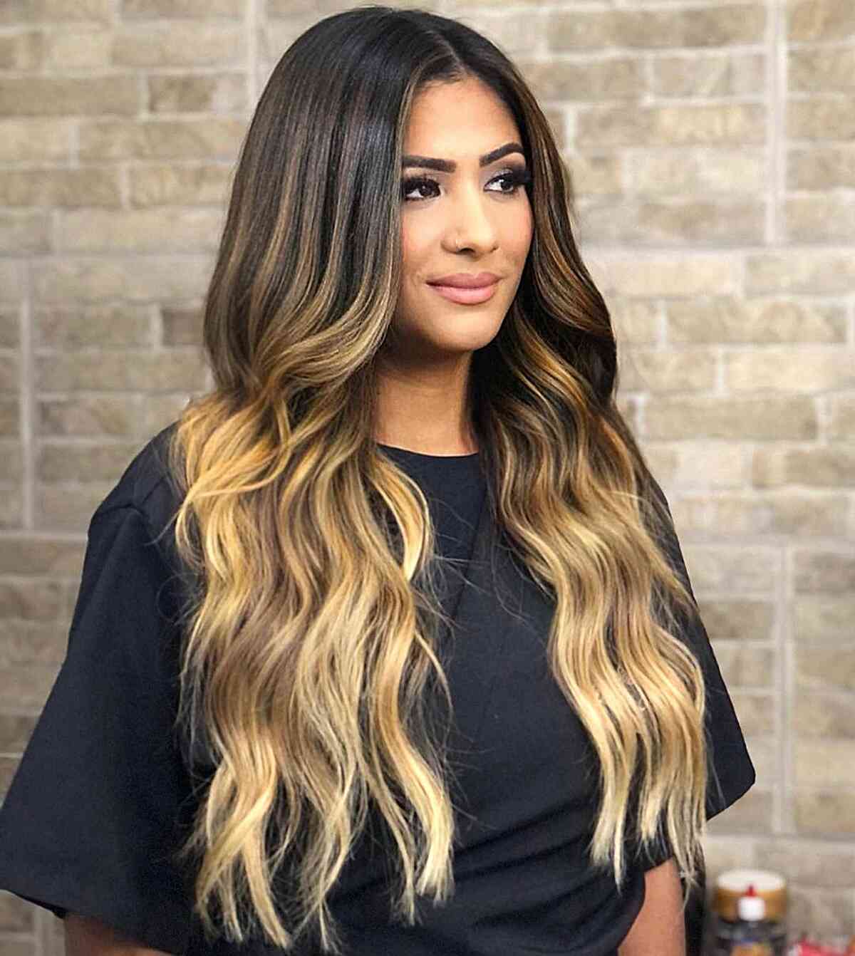This striking ombre begins with rich brunette at the roots and gracefully transitions into golden blonde at the tips. Skin that is warm and medium with hair that is naturally medium in color and texture is perfect. The ends of the hair are the oldest and most fragile part of the hair strand. When lightening the ends, make sure to consider this.