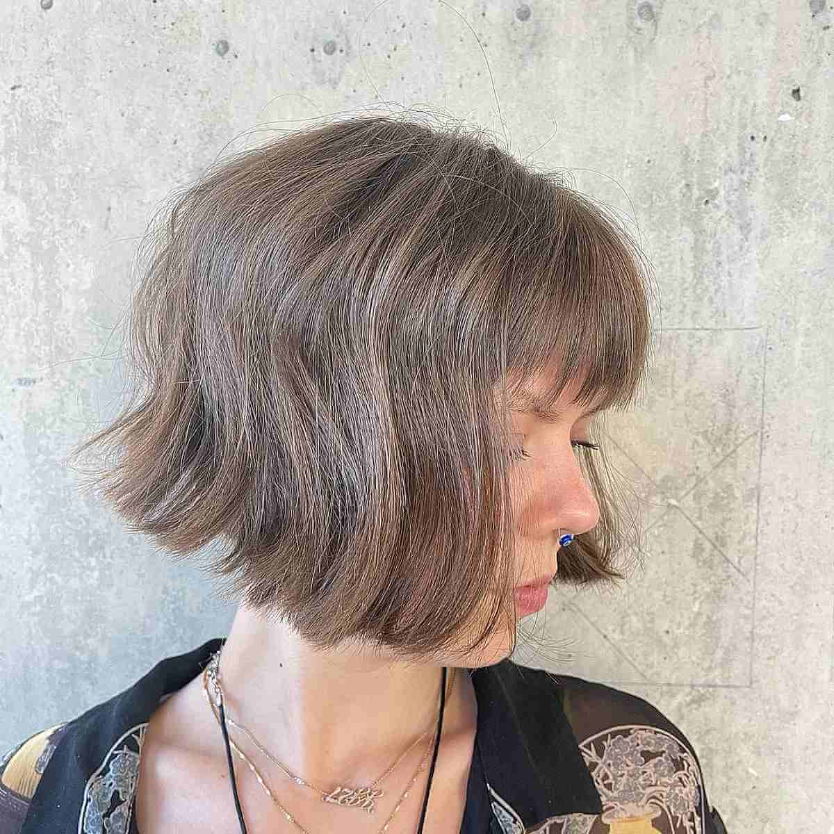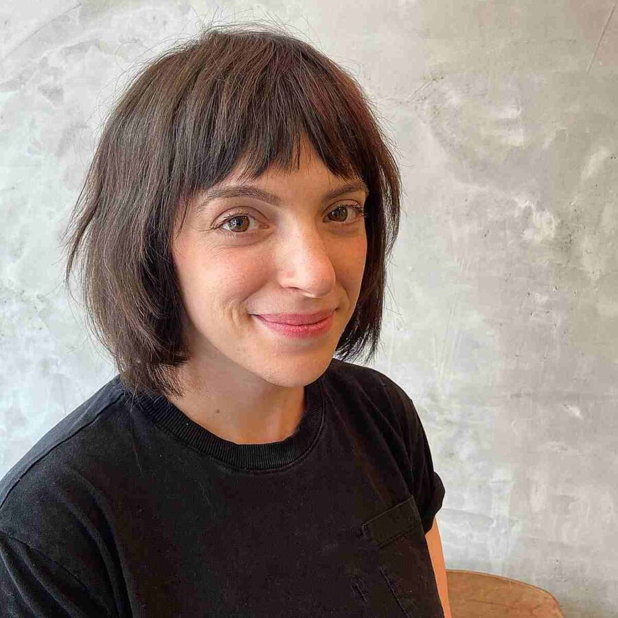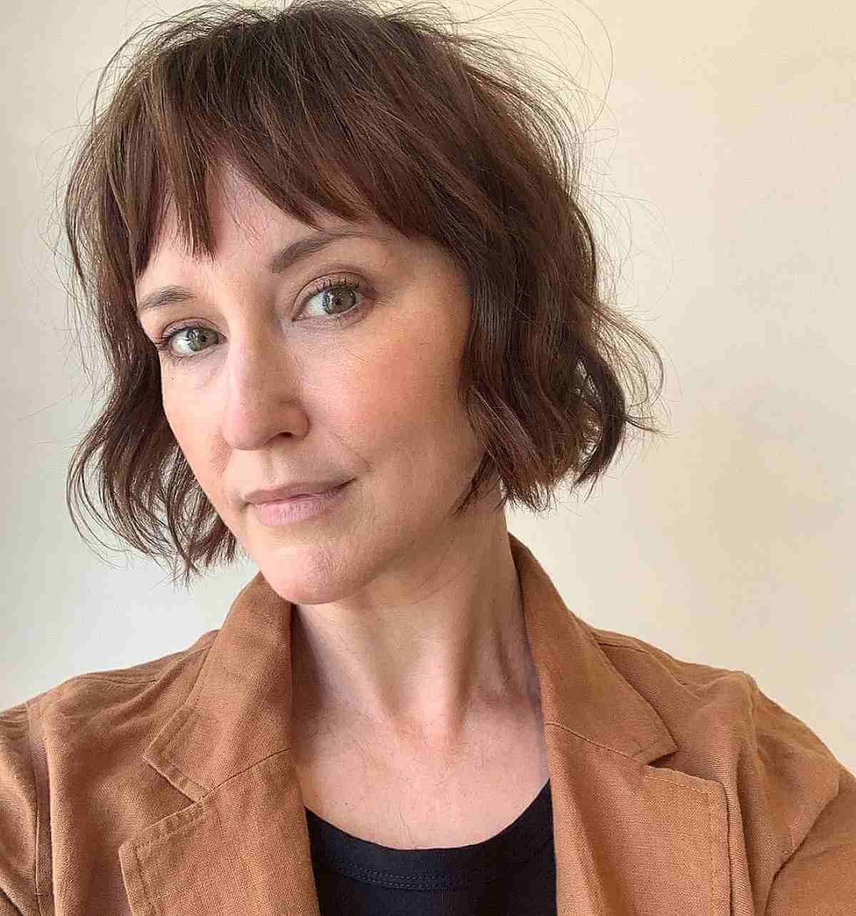 Request a gentle, tousled sliced bob with bangs for a refined yet effortless appearance. If you’ve experienced dull bobs over the years, worry no more, because introducing texture to bangs is an excellent method to reduce bulk from blunt cuts.