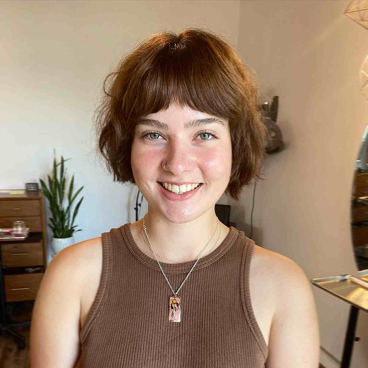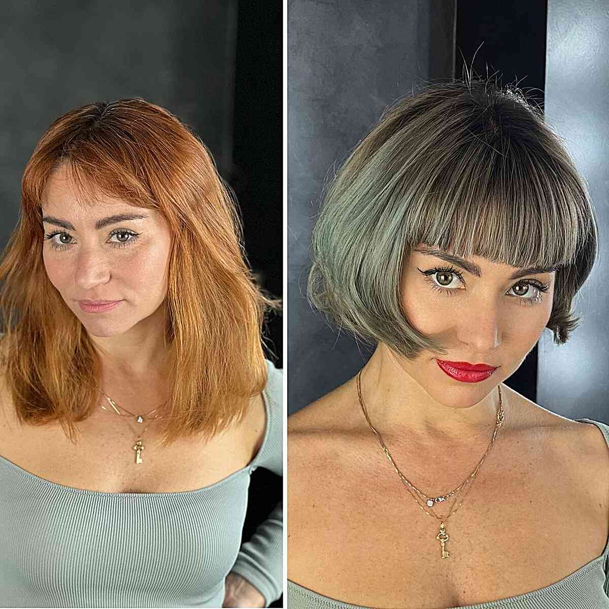 Consider a sleek and timeless copper bob paired with a textured fringe. A jaw-length bob accentuates the neck and gracefully contours your cheekbones, providing a flattering lift.