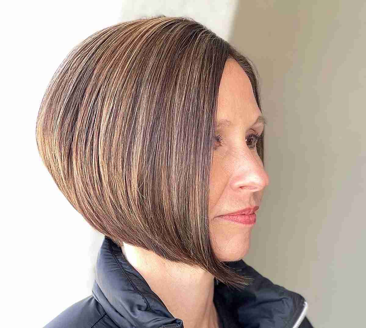 Opting for a brown bob with stacked layers is an excellent choice for mature women. This hairstyle serves as a fantastic source of inspiration, combining a lively vibe with a polished and professional appearance. Employing razor-cut techniques on your bob can achieve a gentle and textured finish.