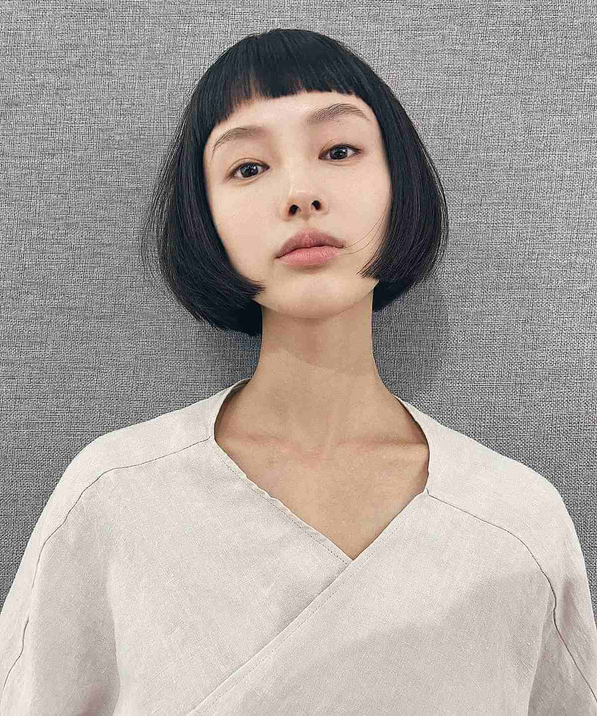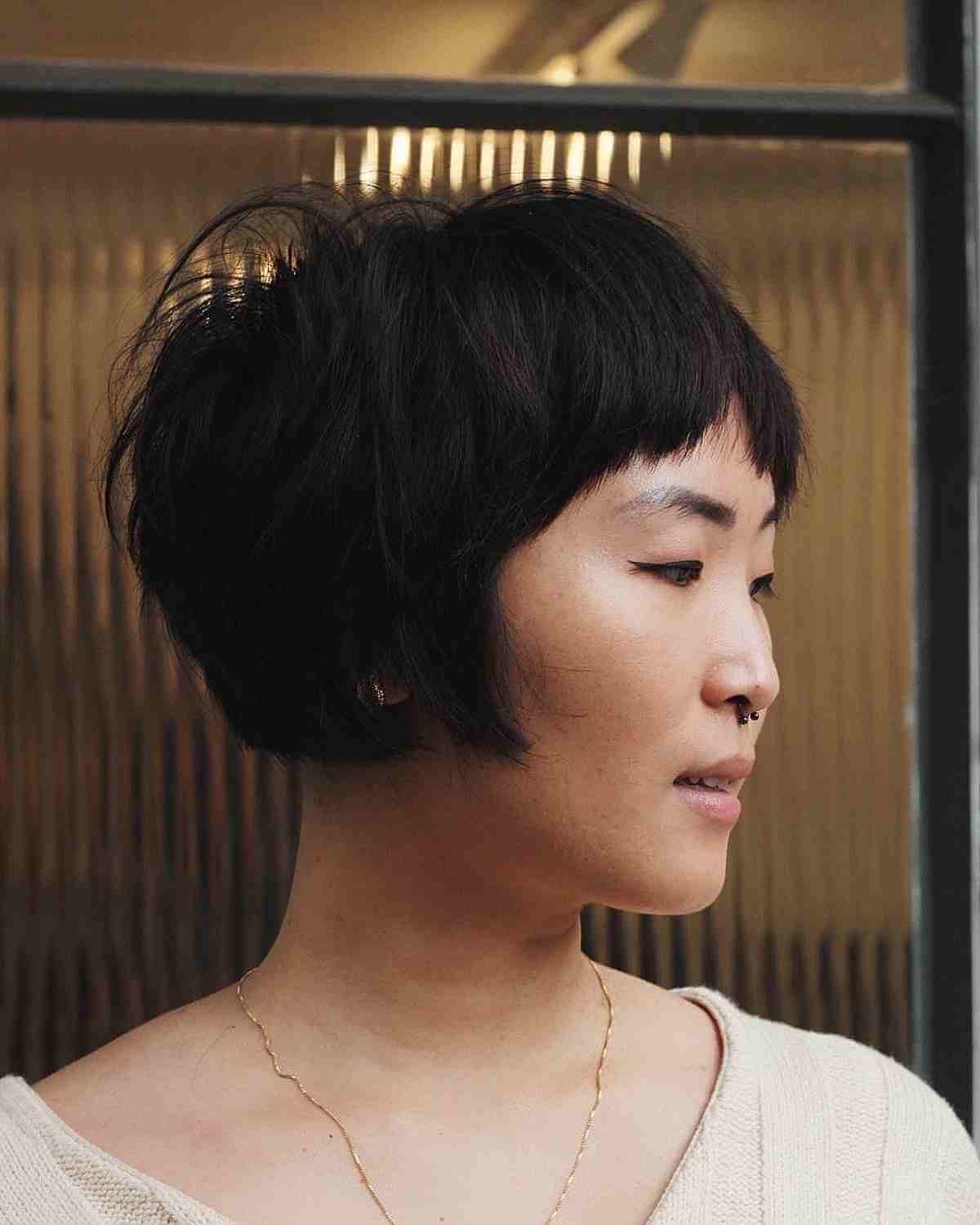 This stylish bob for individuals with fine hair and bangs is perfect for those who appreciate short Asian hairstyles. This hairstyle showcases a gently layered bob to enhance volume and flow, paired with bangs that beautifully frame the face.