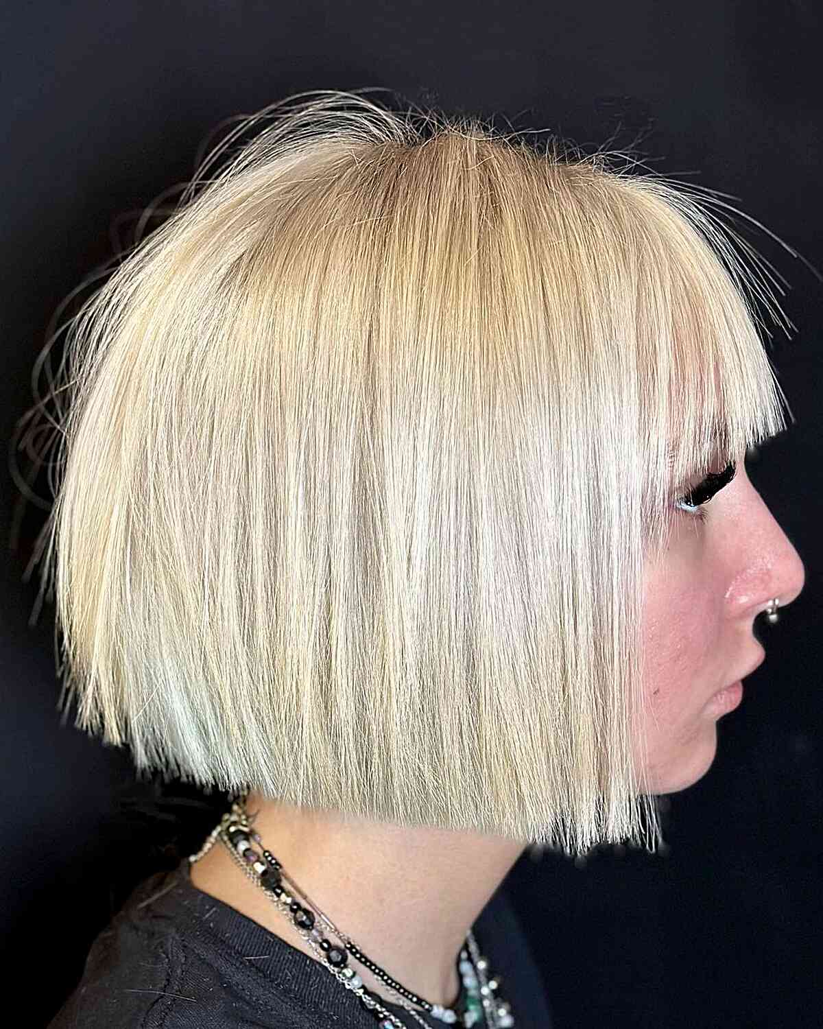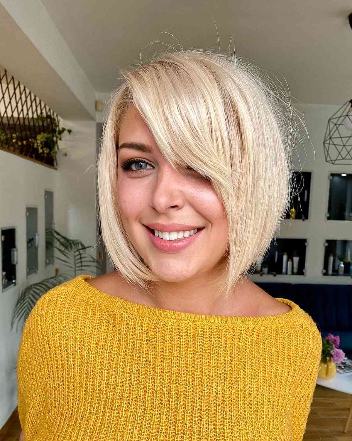 Transform your regular bob into a stunning platinum bob with face-framing bangs.