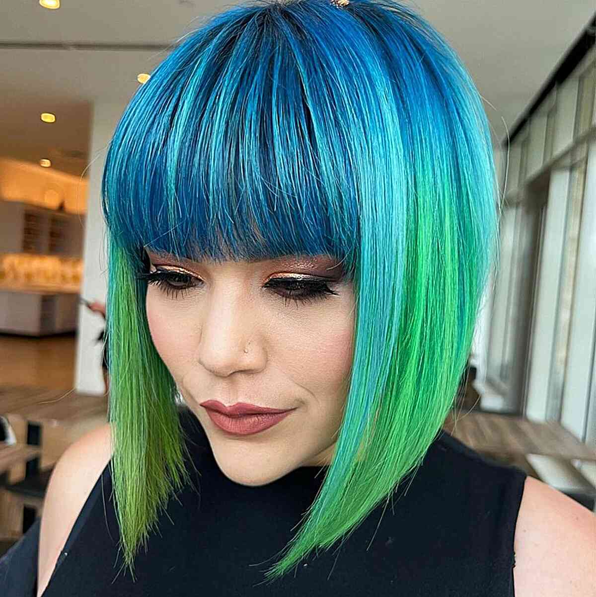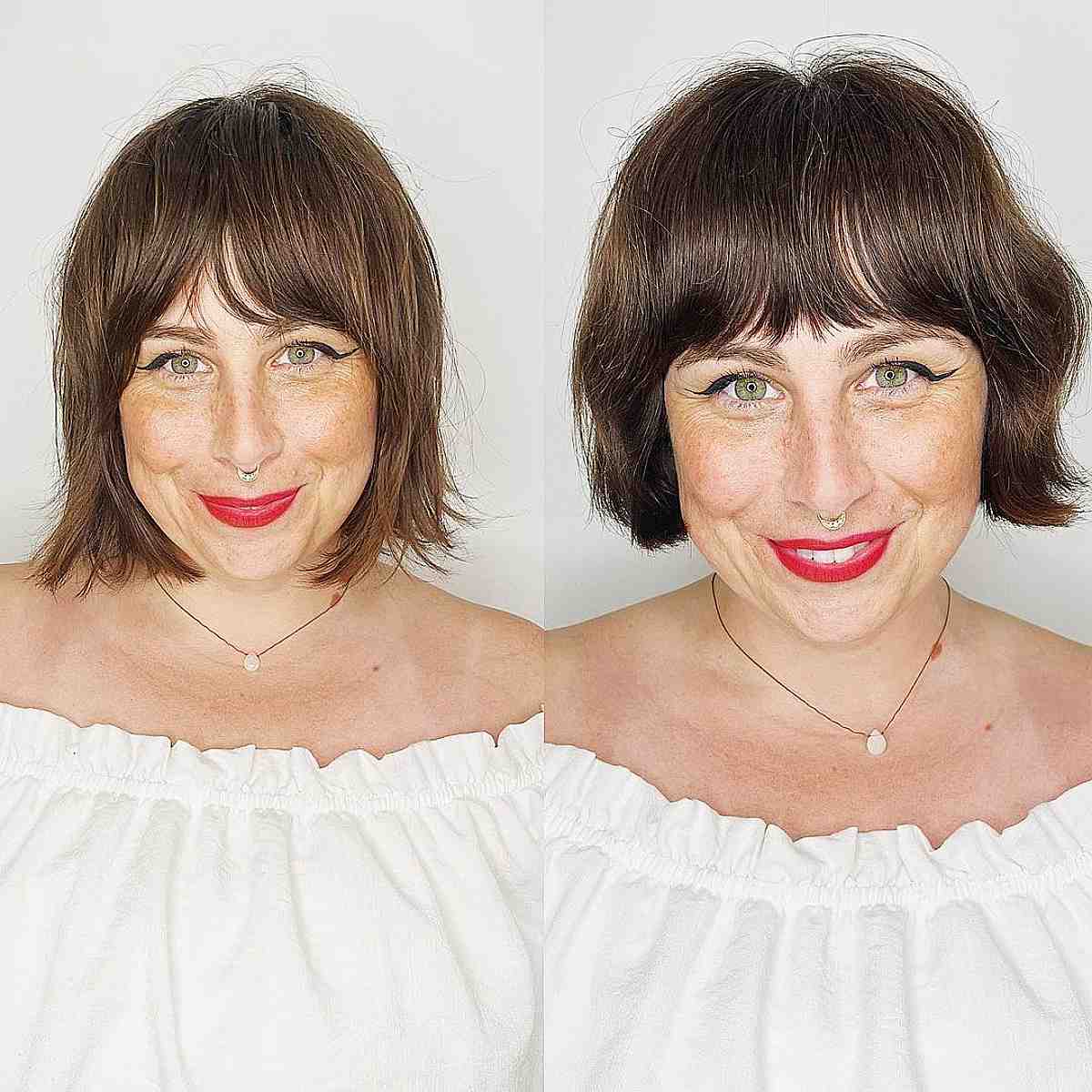 Achieve a fashionable look with a precision bob paired with a blunt fringe. A blunt bob offers a stunning style suitable for various hair types and textures. This cut is versatile, complementing both wavy and straight hair.