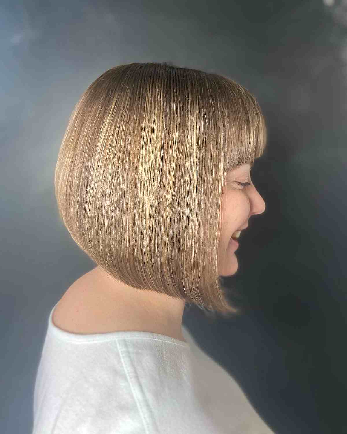 A beautifully shaped jaw-length graduated bob beautifully frames your face, particularly when complemented by full bangs.
