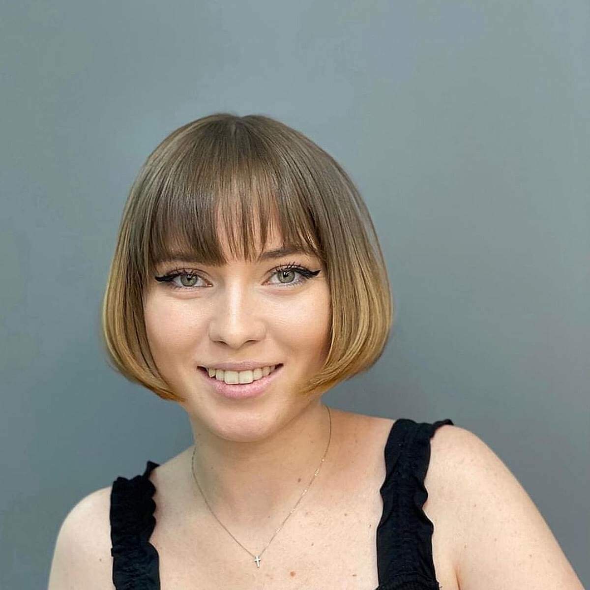Transform your hair with a one-length bob featuring sleek, short bangs. This style is low-maintenance and perfect for straight and fine hair. The cut is effortlessly stylish, and when combined with a strawberry blonde shade, it creates a stunning look. Your hair will appear fuller and shine beautifully in the light.