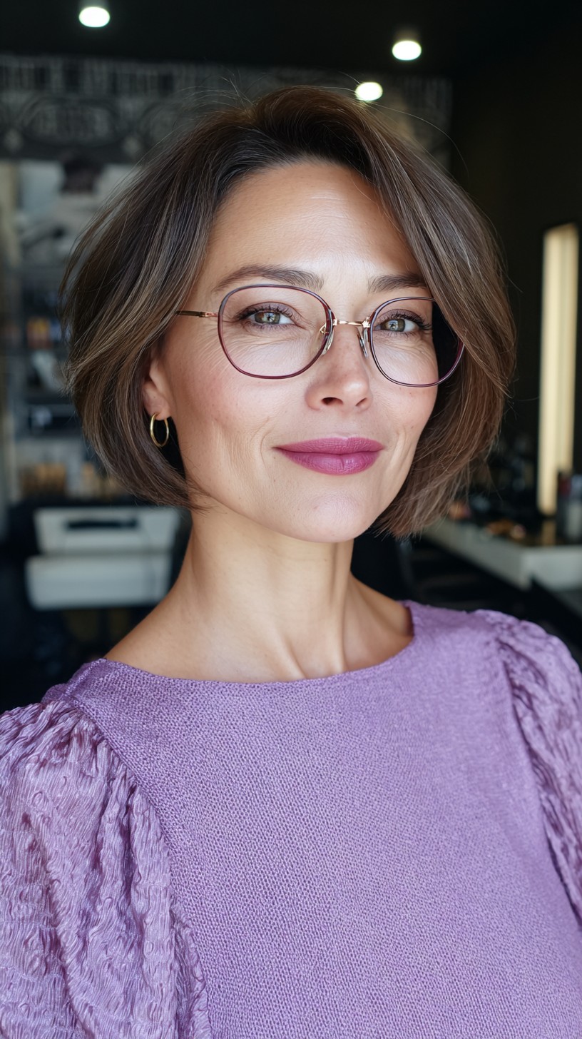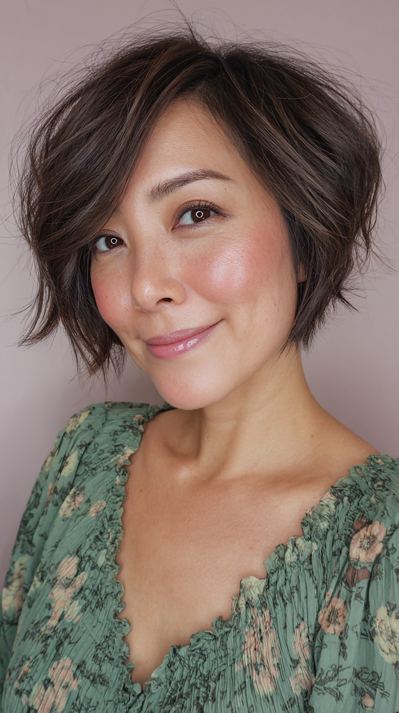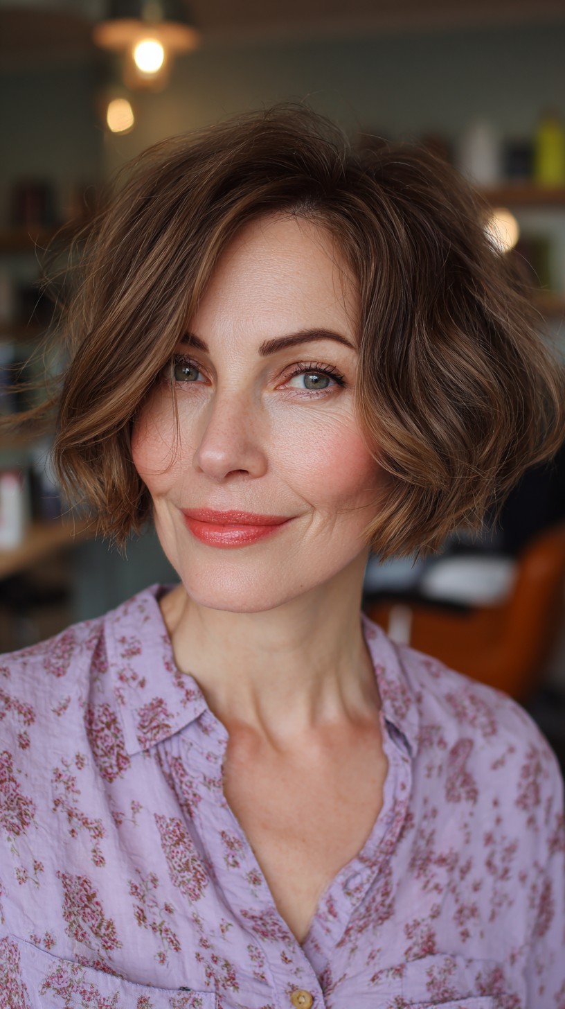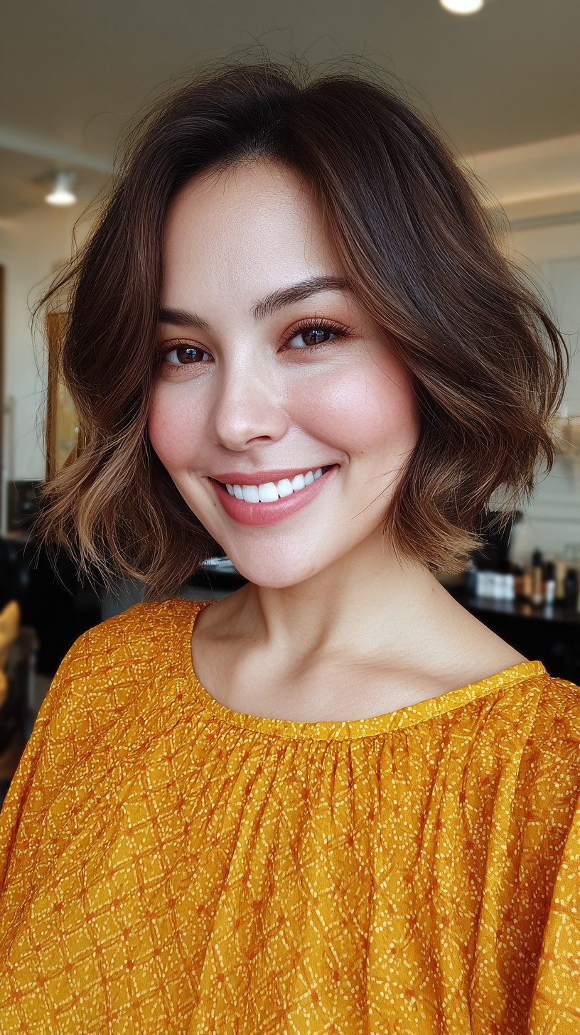 This chic brunette bob is cut just above the shoulders with subtle waves adding texture and body, perfect for fine hair seeking volume. The lightly feathered bangs balance the roundness of the face, complementing soft facial features. The haircut is versatile enough for different styling options, making it ideal for someone looking to add a playful yet manageable style to their routine. However, this style may require regular styling to maintain the wave and fresh appearance of the bangs. A touch of light mousse or wave spray can enhance the texture without weighing down the hair.