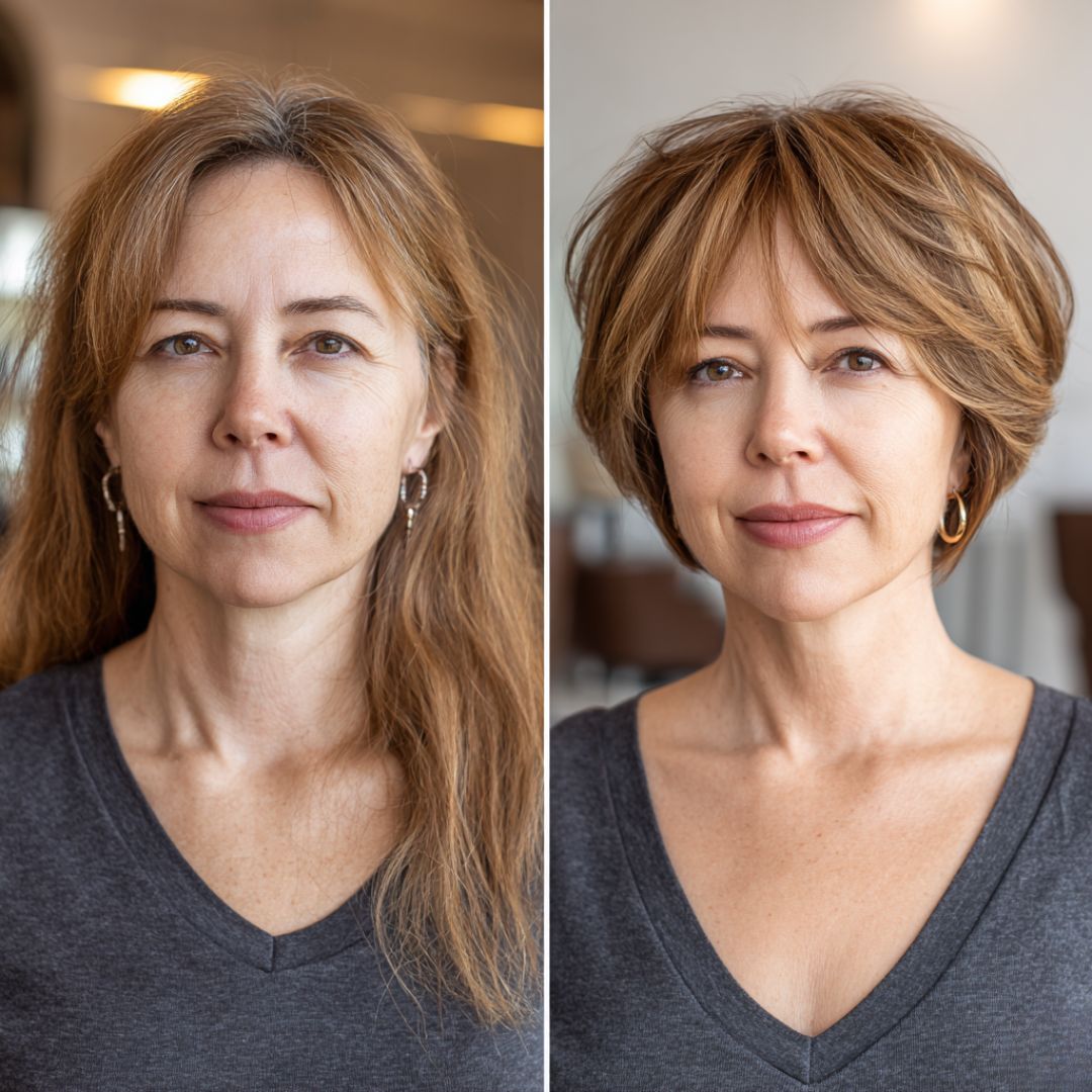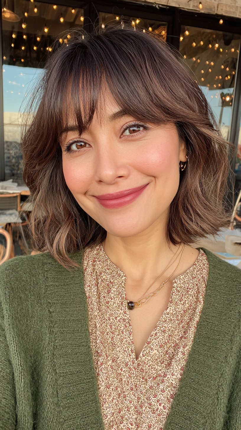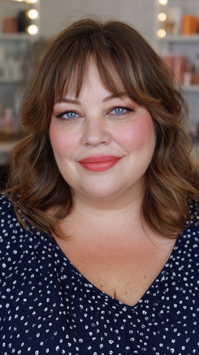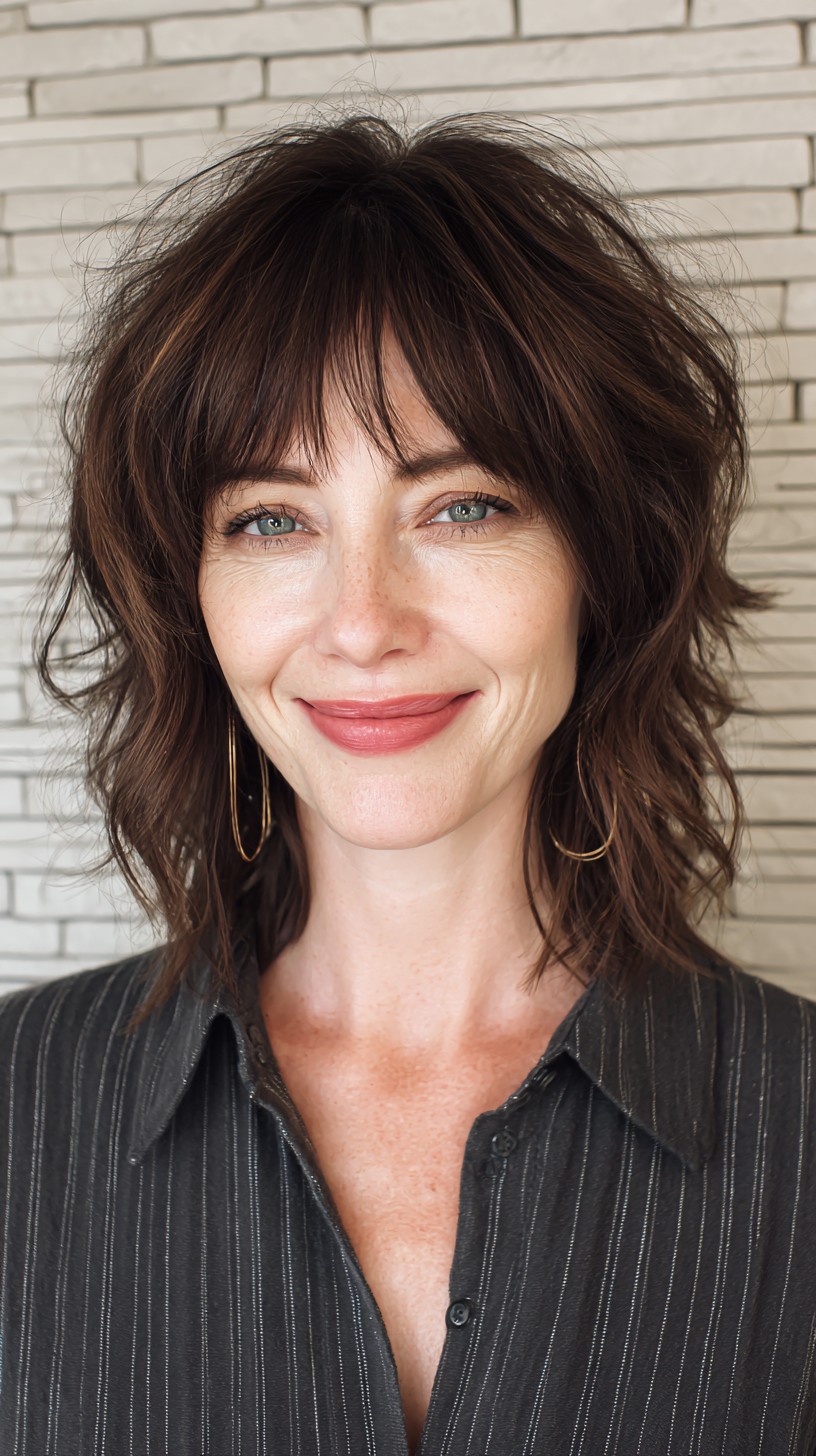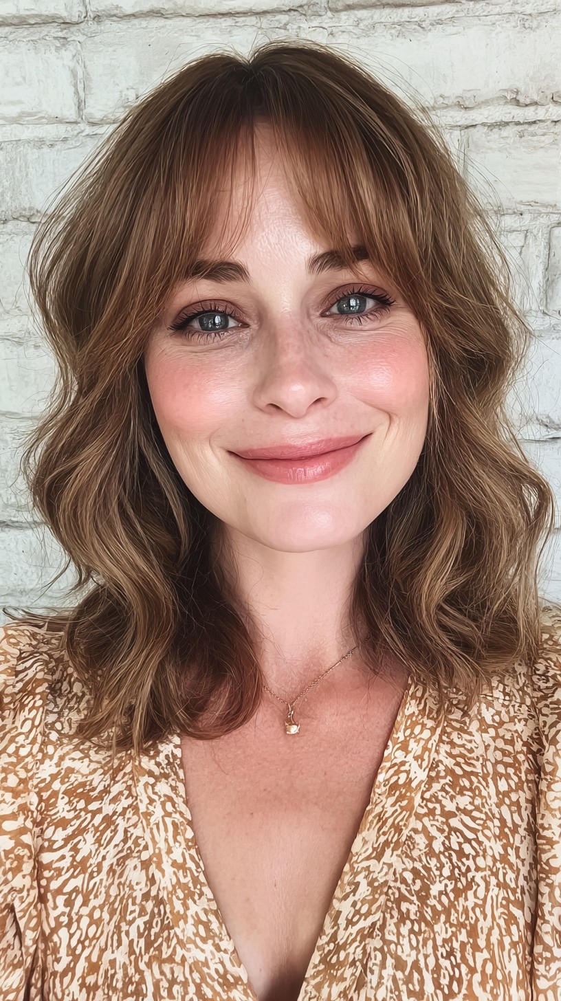 This hairstyle is a perfect go-to for enhancing volume in thin hair. The soft waves integrated into the mid-length cut help amplify the body, while the fringe adds a playful yet mature look. The warm chestnut color brings depth and richness, making the hair appear fuller. Ideal for oval and round face shapes, this style suits those looking for a youthful yet manageable haircut. The layered cut encourages movement, making thin hair look more voluminous. However, it requires a bit of styling to maintain the wave—nothing a quick curling session can’t handle.