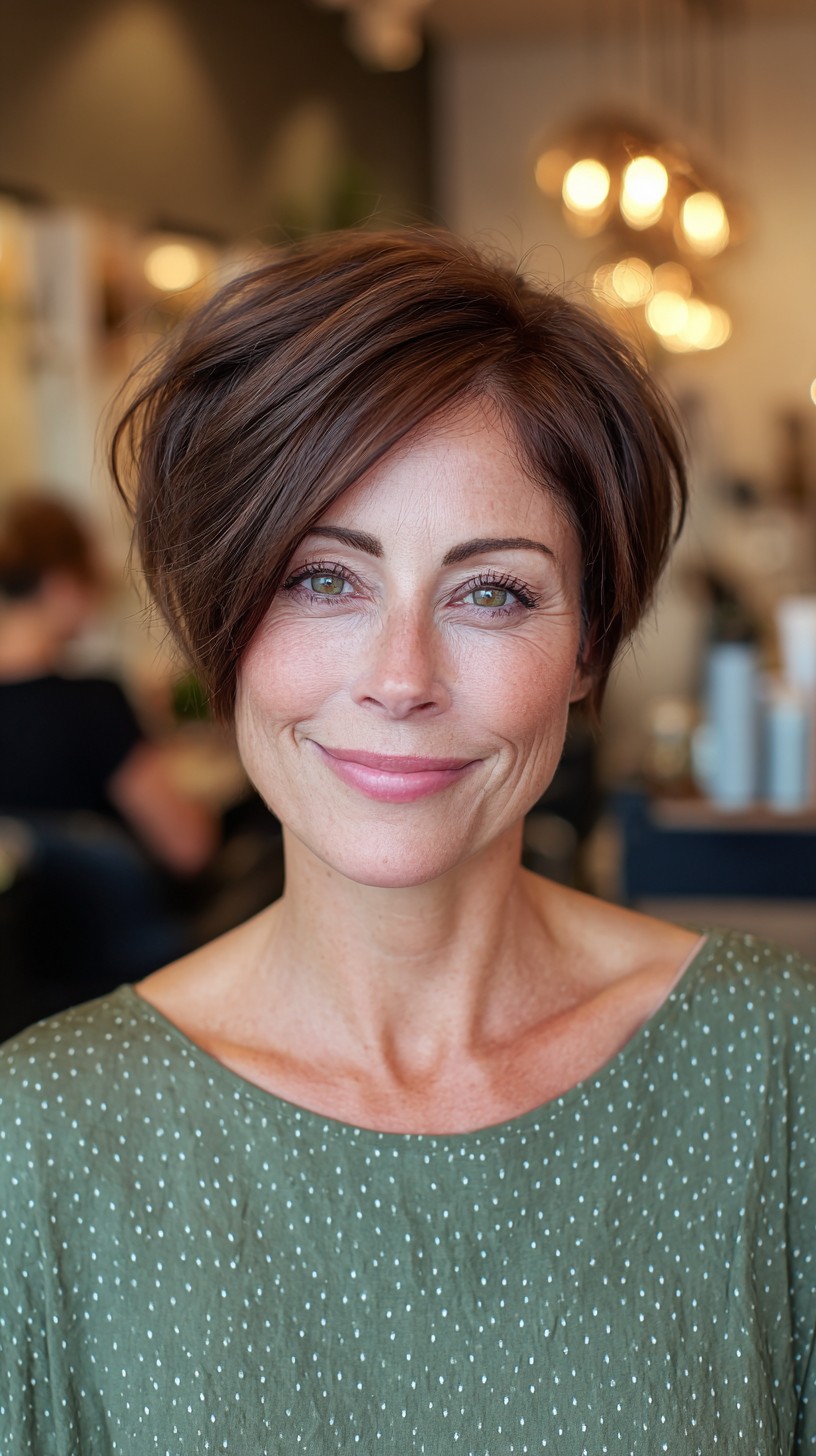 This tousled pixie cut is a fantastic choice for fine hair, bringing volume and a dynamic silhouette to the style. With the hair closely cut at the back and delicately layered at the top, it offers a lively texture that compliments an oval or heart-shaped face. The rich chestnut shade enhances the overall look, providing depth where it’s usually lacking in thinner hair. The light tousling is easy to manage, making it great for a busy lifestyle. However, this style might require frequent trims to maintain the intended shape and fresh look.