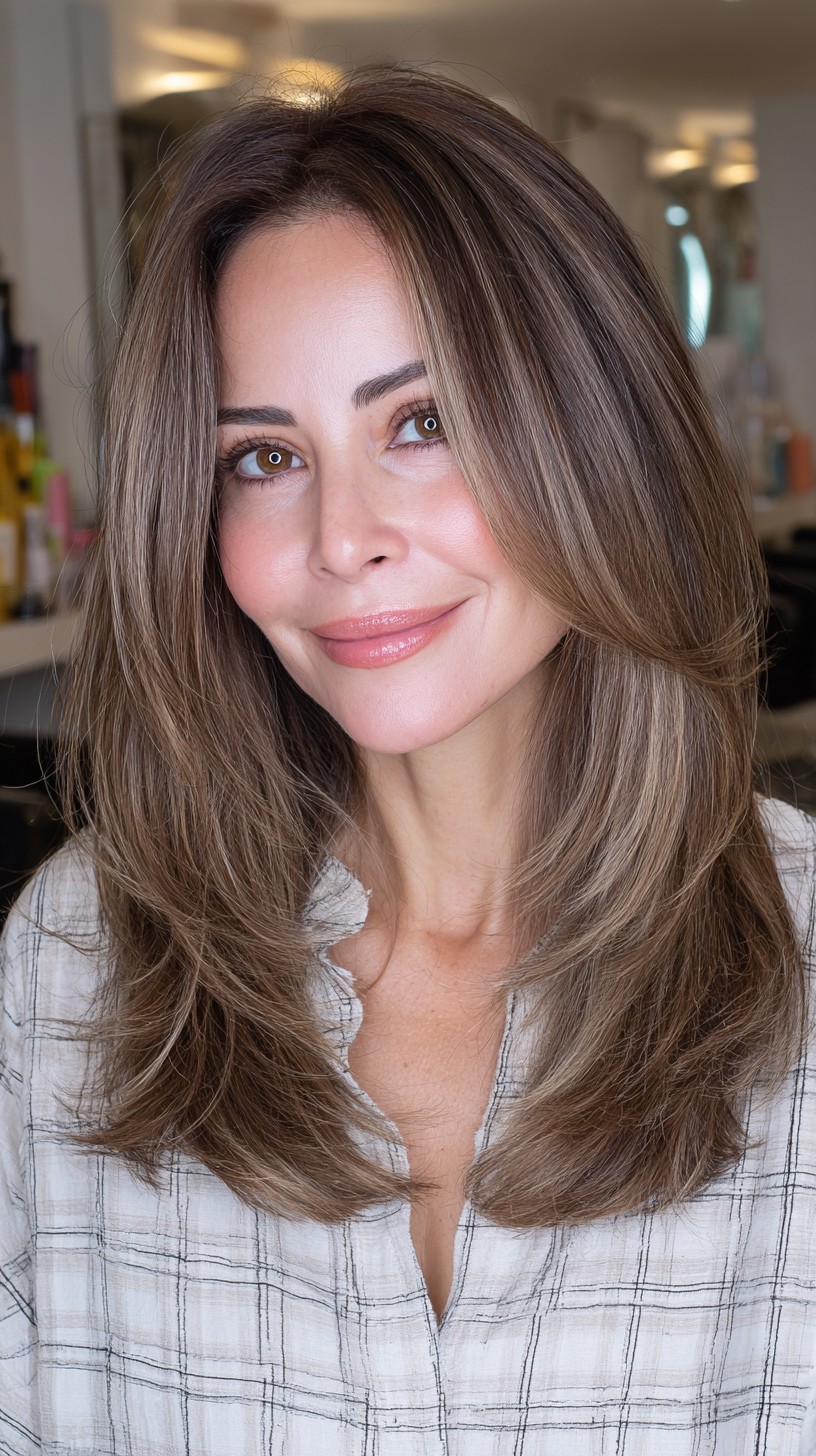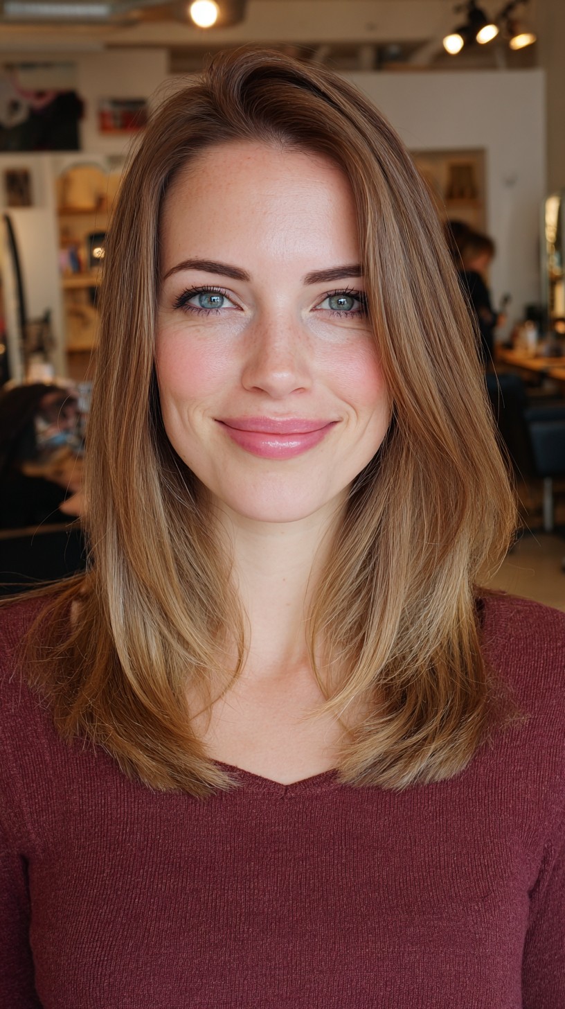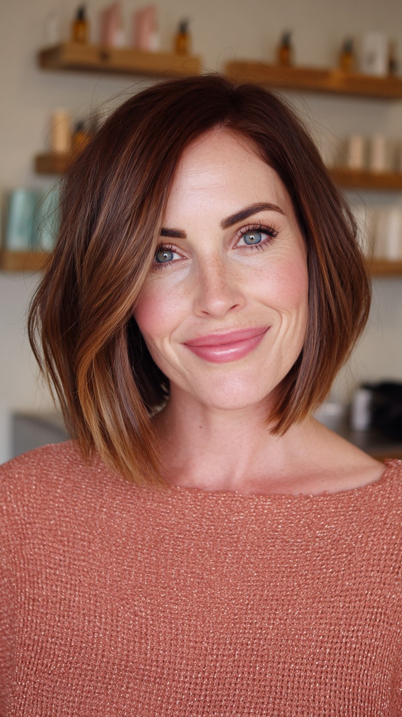 This shoulder-length haircut with light layering adds bounce and volume, making it a top pick for fine-haired ladies. The subtle balayage enhances depth and dimension, achieving a fuller look. This style works great for oval and heart-shaped faces by softening features naturally. However, the color may require maintenance to keep the depth vibrant. Perfect for your busy schedule, this versatile look requires minimal styling time and could really highlight your natural beauty. Plus, these caramel tones are just right for brightening up your complexion!