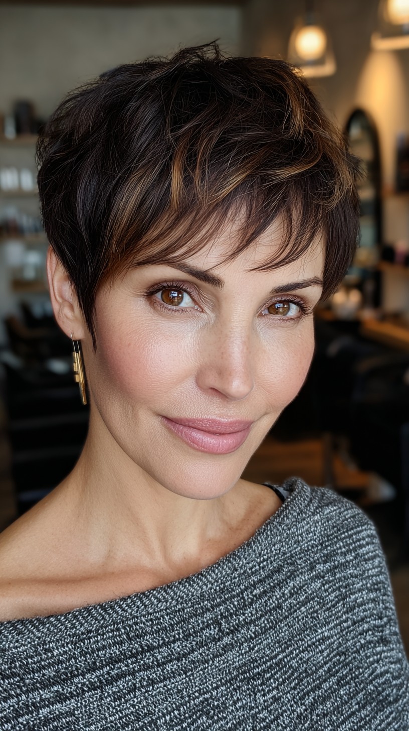 This pixie cut demonstrates a fabulous choice for adding volume to fine hair. The model’s hair is cut short with longer, textured pieces on top, enhancing volume and making styling a breeze. The subtle caramel streaks through the deep espresso base provide a dimensional look while keeping maintenance low. Ideal for an oval face shape, this look adds sharpness to softer facial features. However, it might require regular shaping every few weeks to maintain the crisp style.