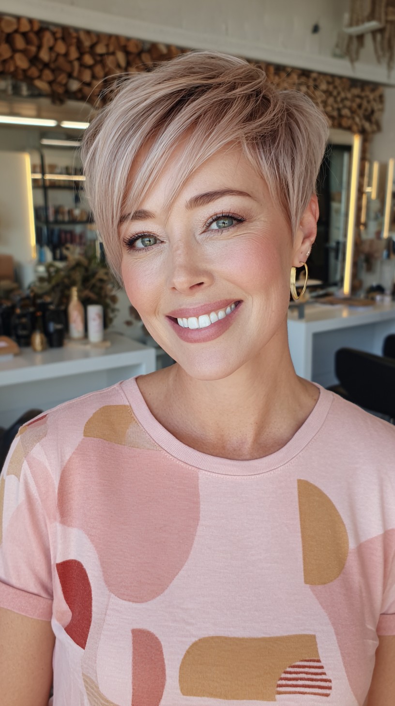 This vibrant pixie cut exemplifies chic balance—ideal for adding volume to thinner hair while maintaining easy upkeep. The sweeping fringe gracefully softens facial features, perfect for an oval or square face. Notably, the multi-tonal blonde catches light, giving the illusion of denser hair. While this style offers quick styling, frequent salon visits might be necessary to maintain the precise shape and refreshing color tones. Perfect for those looking for a youthful, yet manageable modern look.