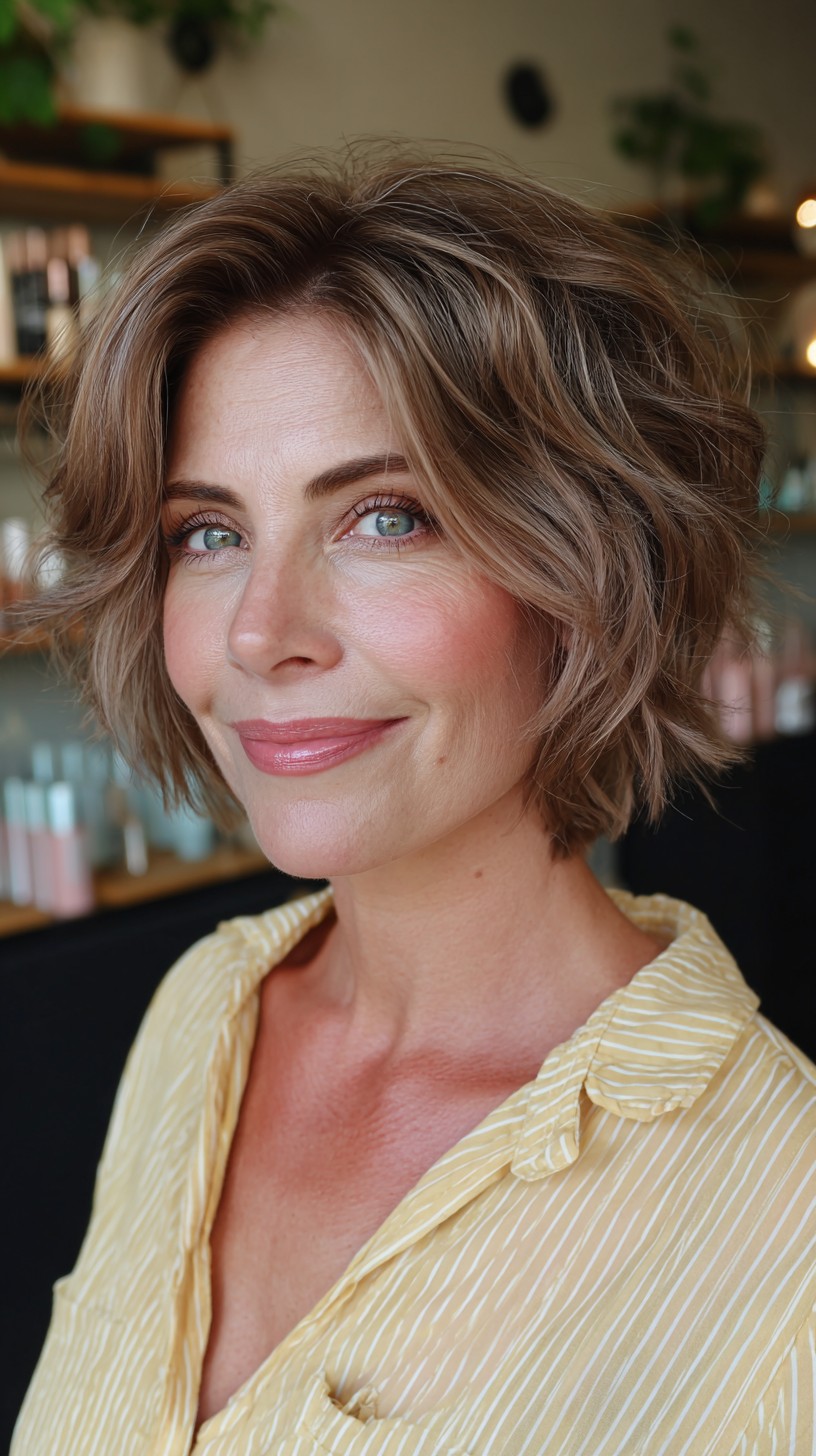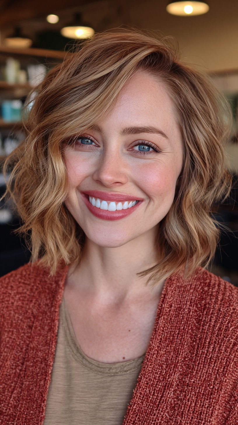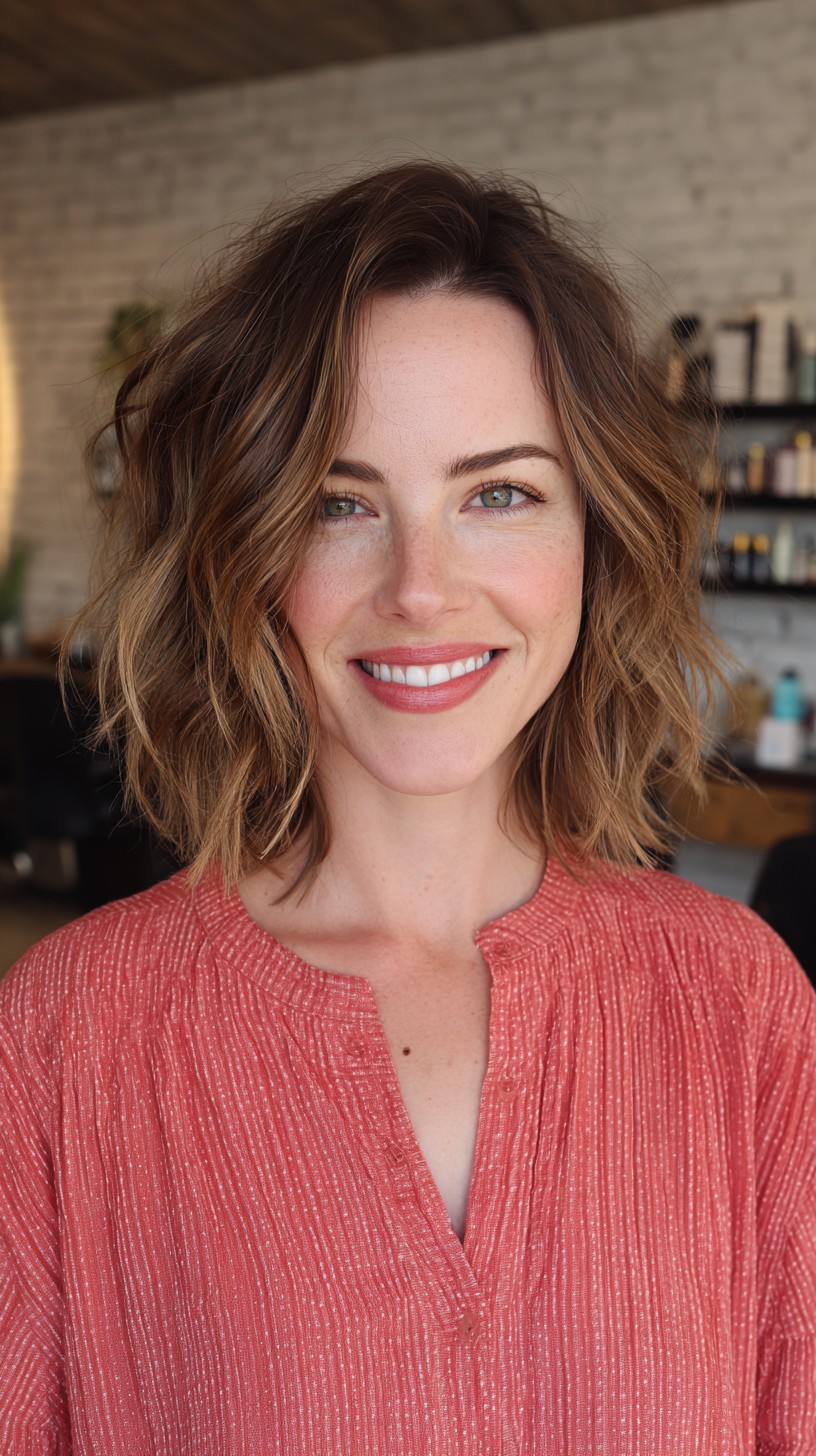 This textured bob is perfect for thin hair, featuring shoulder-length strands that create a fuller appearance. The soft waves add volume, while subtle highlights enhance depth. Ideal for round and oval face shapes, this cut requires minimal styling—just a bit of mousse and a diffuser for that effortless look. The slightly tousled finish offers a playful, flattering vibe. Consider this cut for a low-maintenance style that still packs a punch with its chic texture and movement.