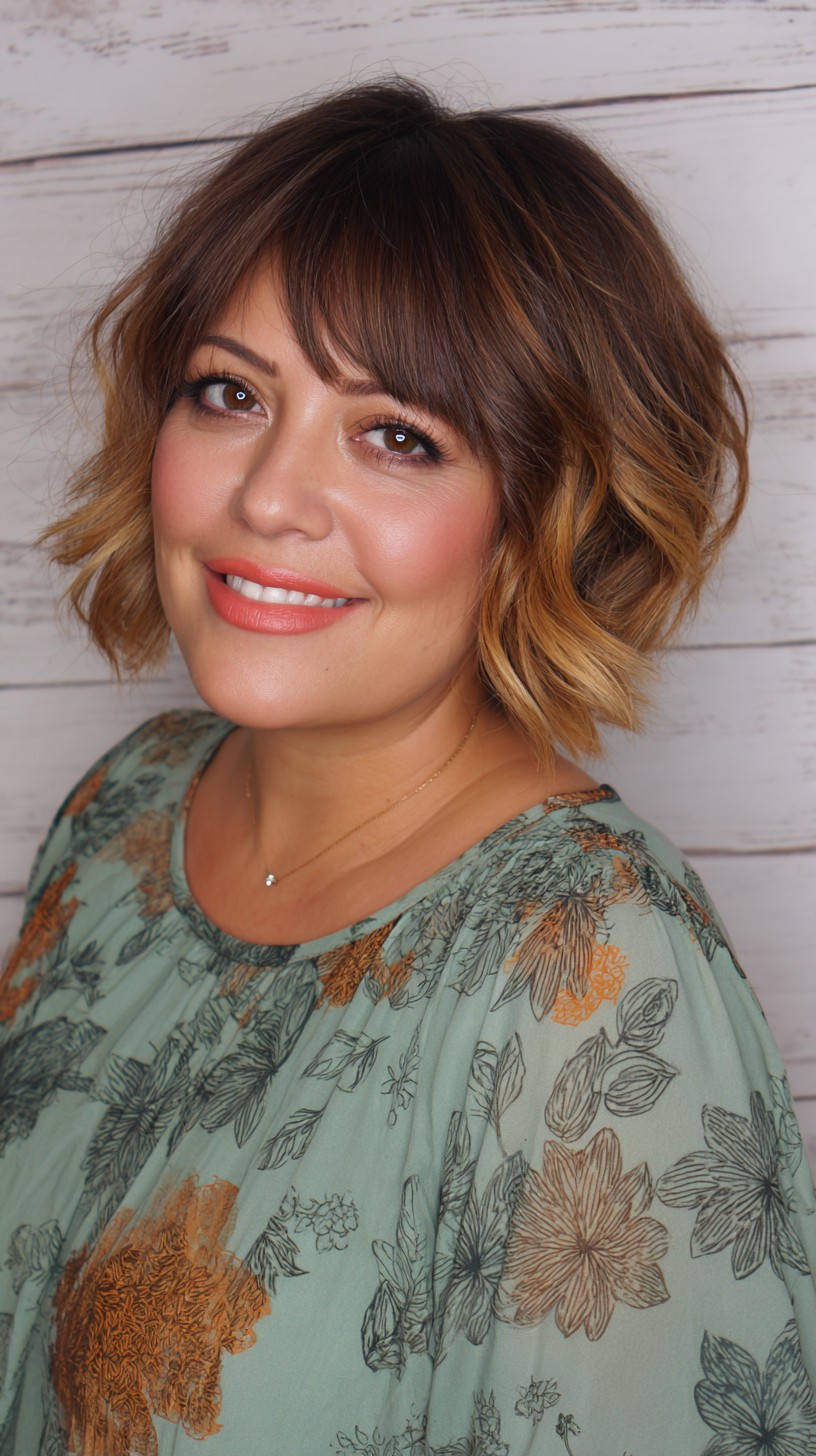 Get a fresh, youthful look with this shoulder-length cut featuring luminous caramel waves and a soft fringe that gracefully frames the face. Ideal for fine hair, the layering here enhances volume, and the fringe adds style without overpowering the facial features. The caramel tones brighten the complexion, making it an excellent choice for those needing a little lift in their appearance. A slight downside is the requirement for regular styling to maintain the wave and vibrancy of the color, especially if your hair tends to go flat or lose shape quickly.