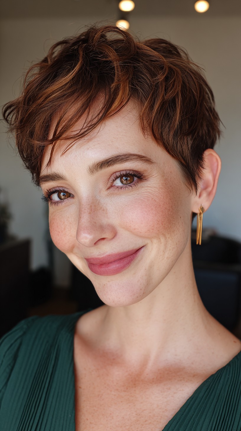 This cut is perfect for gals looking to add volume to thin hair while keeping things stylish. This pixie comes in a rich auburn shade, offering a warm pop of color that complements cooler skin tones beautifully. The textured waves add body, giving the illusion of thicker hair. The short back and longer top sections create depth and movement. A lovely choice if you want easy upkeep and a bold look. However, frequent salon visits might be required to maintain the shape and color freshness.