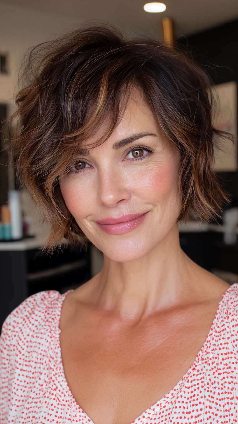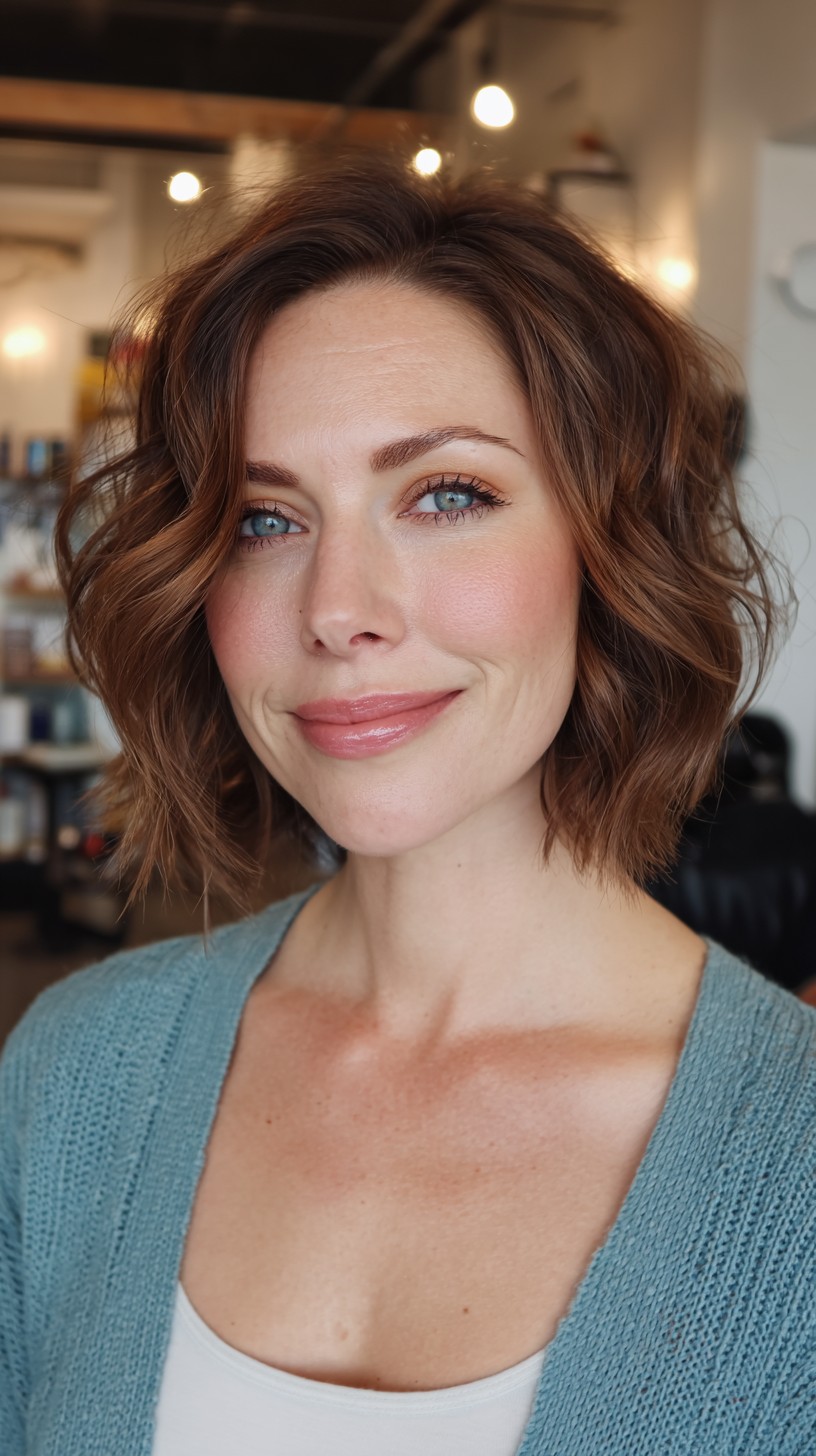 This haircut features graduated layers that enhance volume, making it perfect for ladies with thin hair seeking a fuller look. Its shoulder-length style and soft waves work wonderfully to soften angular faces, while the deep chestnut color adds richness. Remember, styling with waves requires some skill with a curling iron or hot rollers. It’s a great choice for adding movement and texture, but might require a bit of maintenance to keep those waves looking fresh and vibrant.