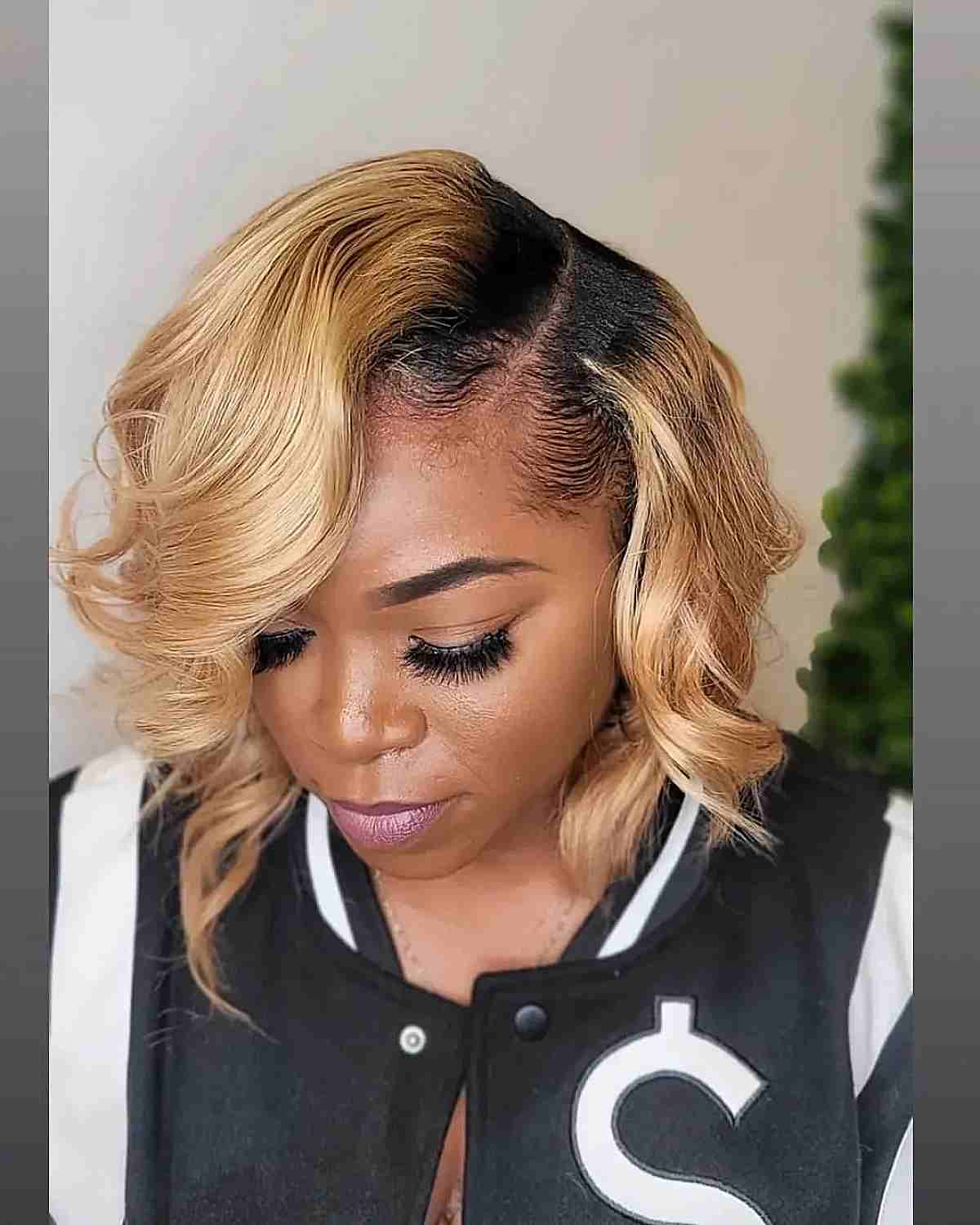 Side-swept bangs paired with curls create a stunning look on short hair styles. This enchanting style appears particularly luxe with blonde or lightened strands.