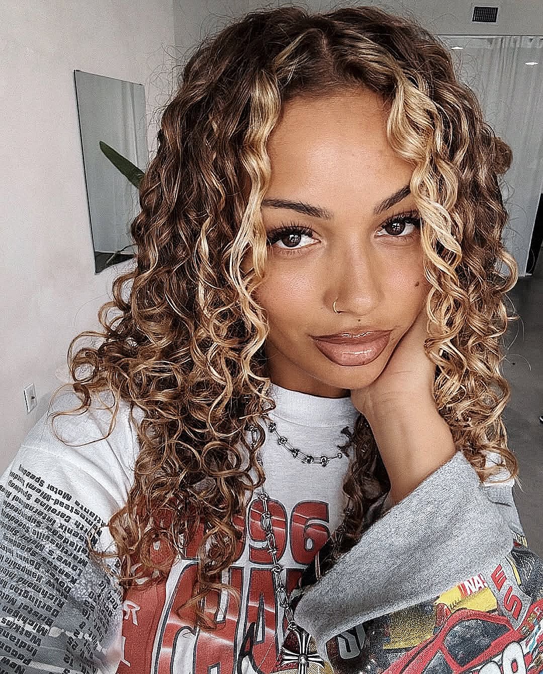 They say blondes have more fun, but curly blondes have the most fun by far. Long blonde curls with layers create a bright and airy frame for faces with lighter undertones. Long layers for curly hair are a staple in creating the ideal shape, movement, and volume of the haircut. With big voluminous curls with lots of volume, lighter hair can have an expanding effect, creating the illusion of even more hair and volume.
