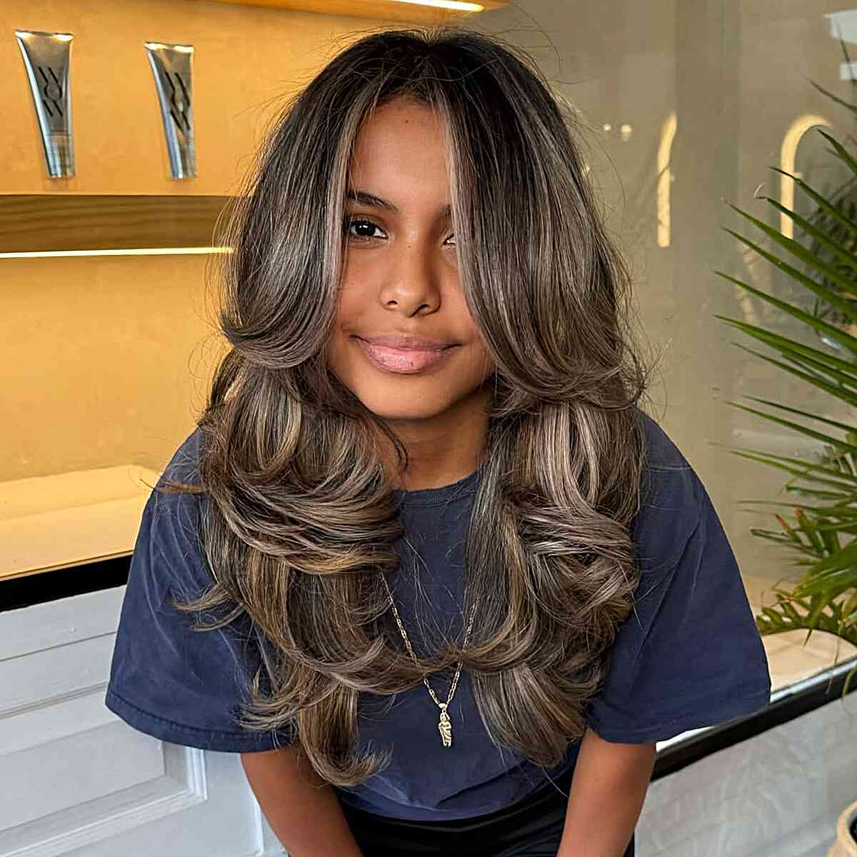 The layered blowout creates full, bouncy curls that add depth and volume to long hair. The highlights accentuate the curls and layers, giving dimension. Best for medium to thick hair, this style holds well with natural volume. Fine hair might require additional styling products to keep the curls lifted throughout the day.