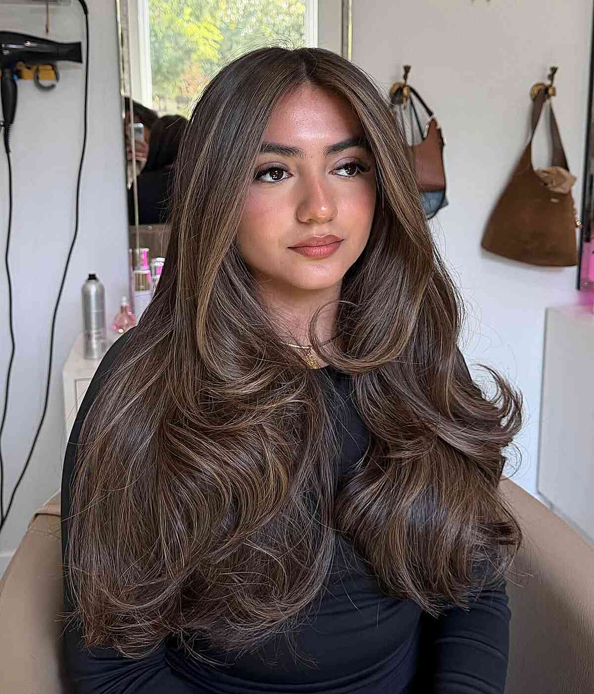 This hairstyle features long, voluminous layers that enhance movement and body, perfect for those with medium to thick hair. The subtle warm brown tone adds depth, while the blowout finish creates a polished look. This style complements oval or heart-shaped faces beautifully. For styling, a round brush and blow dryer will help achieve that bouncy, salon-fresh finish. Consider the maintenance of a layered cut, as it requires occasional texturizing to keep the layers defined and lively.