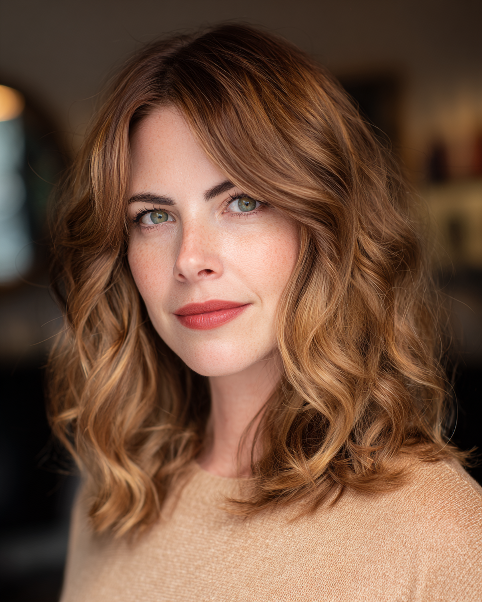This textured medium-length cut features soft waves that beautifully frame the face, ideal for heart-shaped or oval face shapes. The warm caramel highlights add dimension, making it perfect for adding warmth to cooler skin tones. It’s great for those with medium to thick hair density, as the layers create bounce without sacrificing volume. While this style is low-maintenance, it might require some curling product for definition. A unique tip: try using a sea salt spray for that effortless beachy look!