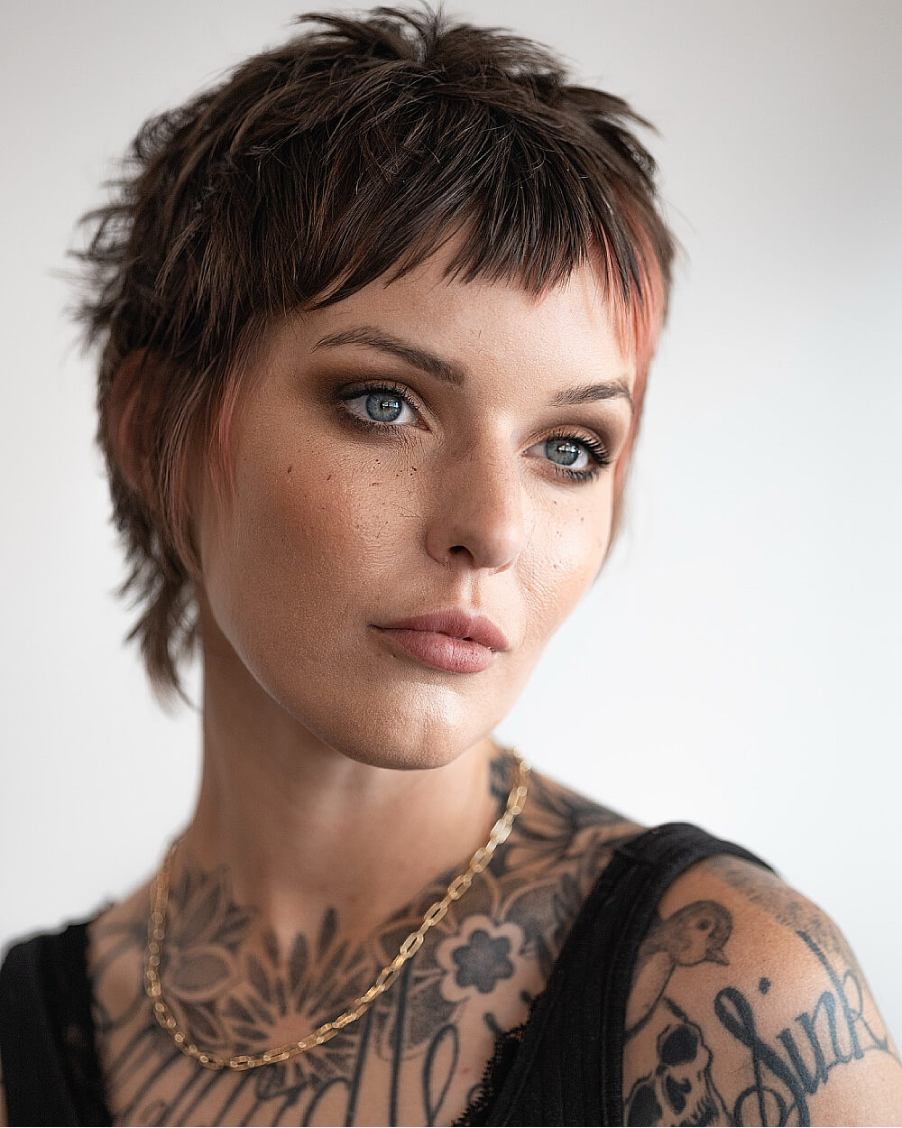 Textured layers and a jagged, choppy fringe give this short pixie a bold, modern edge. The cut works beautifully for medium to thick hair, adding volume and movement without weighing it down. Soft copper highlights at the front brighten the face and break up the dark base for extra dimension. This style flatters oval and heart-shaped faces, but requires regular shaping to keep the fringe sharp and the layers defined.