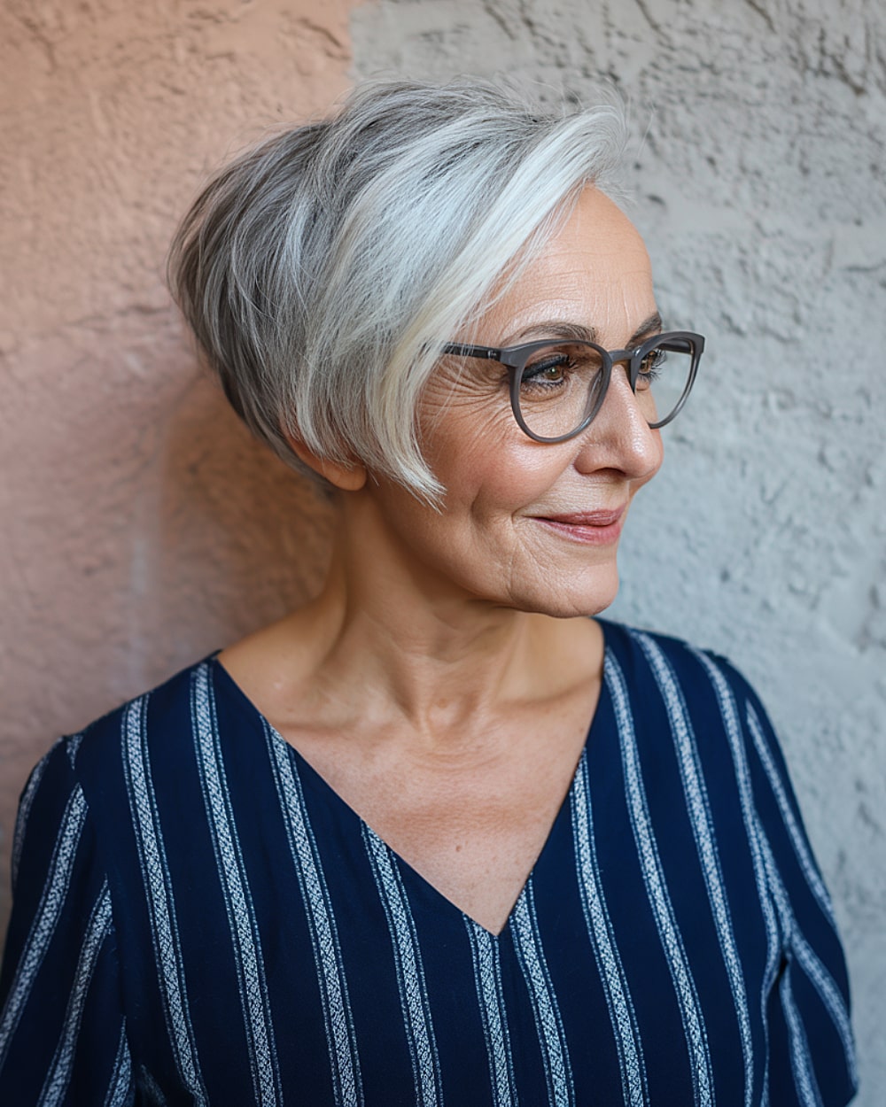 Flattering and functional, this chic pixie bob pairs perfectly with glasses thanks to its gently tucked sides and subtle face-framing layers. Ideal for fine to medium-density hair, it enhances natural gray tones and gives definition around the cheekbones. The longer front gives some styling flexibility—tuck it, sweep it, or let it fall naturally. It’s great for women over 60 who want a polished but practical style.
